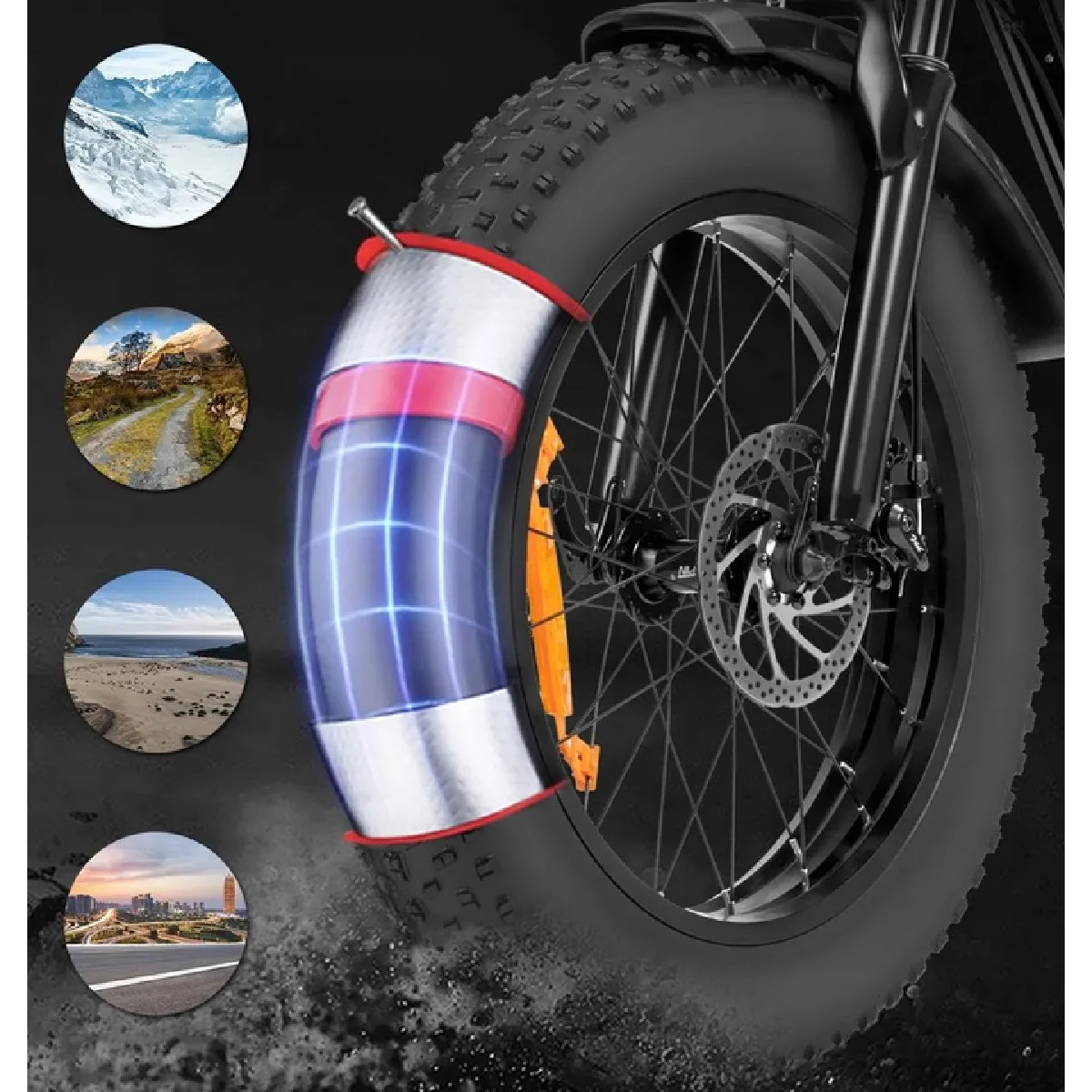 Doté de pneus épais 20×4 pouces à fort adhérence, il sadapte à neige, sable, boue ou chemins caillouteux. Associés à un amortisseur avant et arrière (50 mm de course) et une ramme en acier haute teneur en carbone, ils absorbent parfaitement les bosses, assurant une conduite fluide et sécurisante.