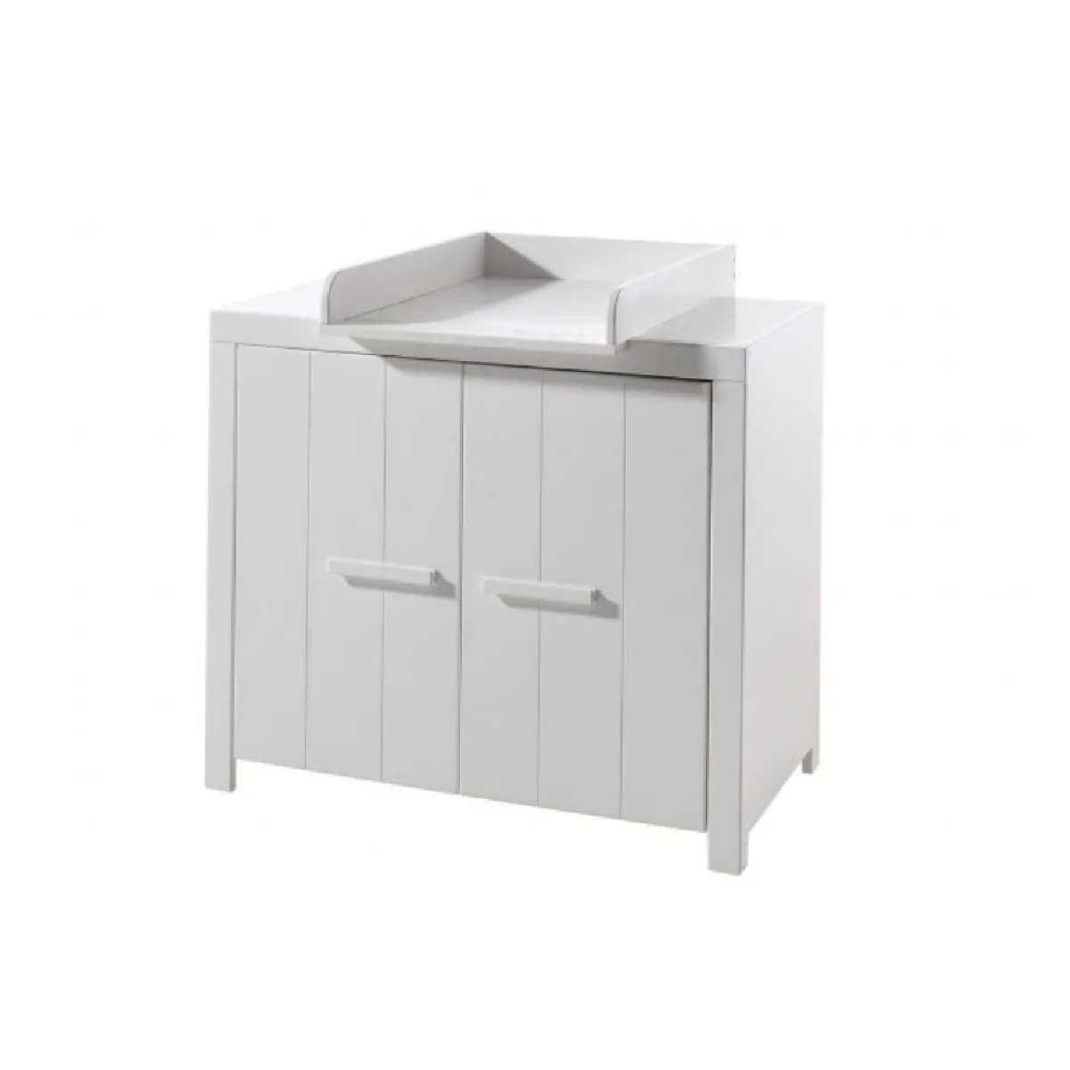 L'espace de change gagne en fonctionnalité grâce à une structure en bois pensée pour durer. Réalisé en pin et MDF, laqué en blanc, ce meuble s'intègre discrètement dans une chambre d'enfant. La zone supérieure sert de base pour le change, tandis que le bas offre un volume de rangement simple et rapide d'accès. Deux portes dissimulent le contenu pour conserver un environnement net. L'ensemble privilégie une organisation claire des essentiels du quotidien, avec une surface facile à nettoyer. La conception se concentre sur des matériaux stables et une finition homogène pour une utilisation régulière dans la routine de soins.