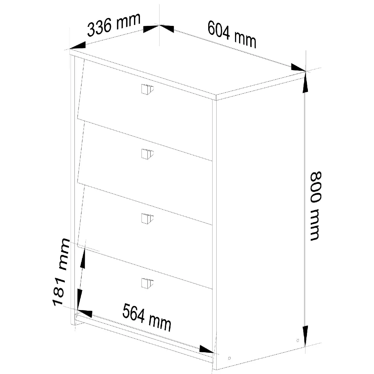 La façade à 4 portes rabattables permet un rangement à chaussures discret avec une manipulation frontale, utile lorsque l'espace est restreint devant le meuble. Chaque porte donne accès à un compartiment séparé, ce qui aide à séparer les paires par usage ou saison et garder une entrée ordonnée. La hauteur de 80 cm reste adaptée sous des patères ou des interrupteurs, tandis que la largeur de 60,4 cm facilite l'intégration entre deux éléments existants. La profondeur de 33,6 cm limite l'encombrement, tout en conservant une capacité de rangement pour usages quotidiens.