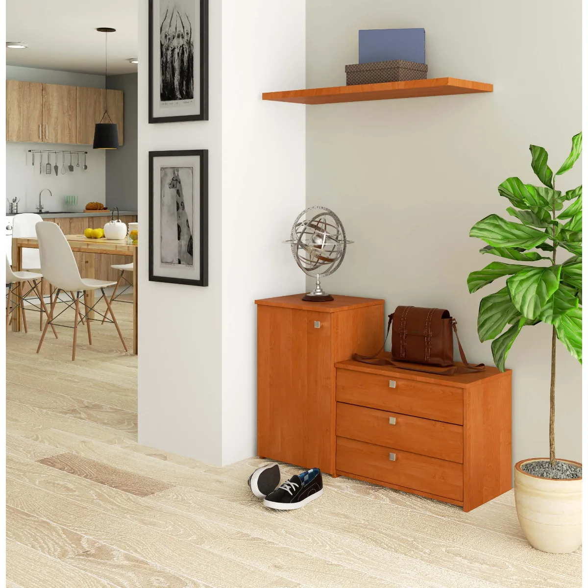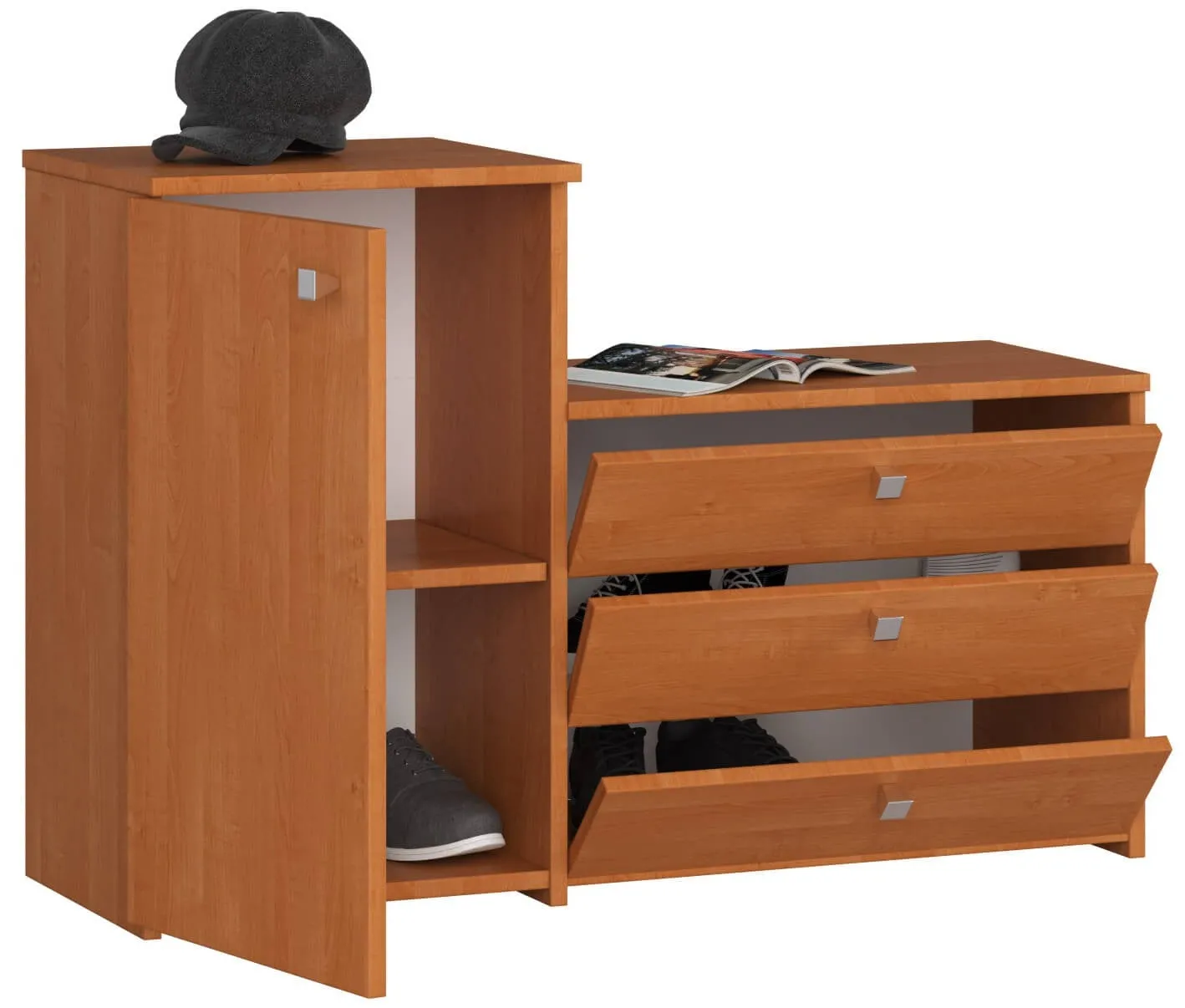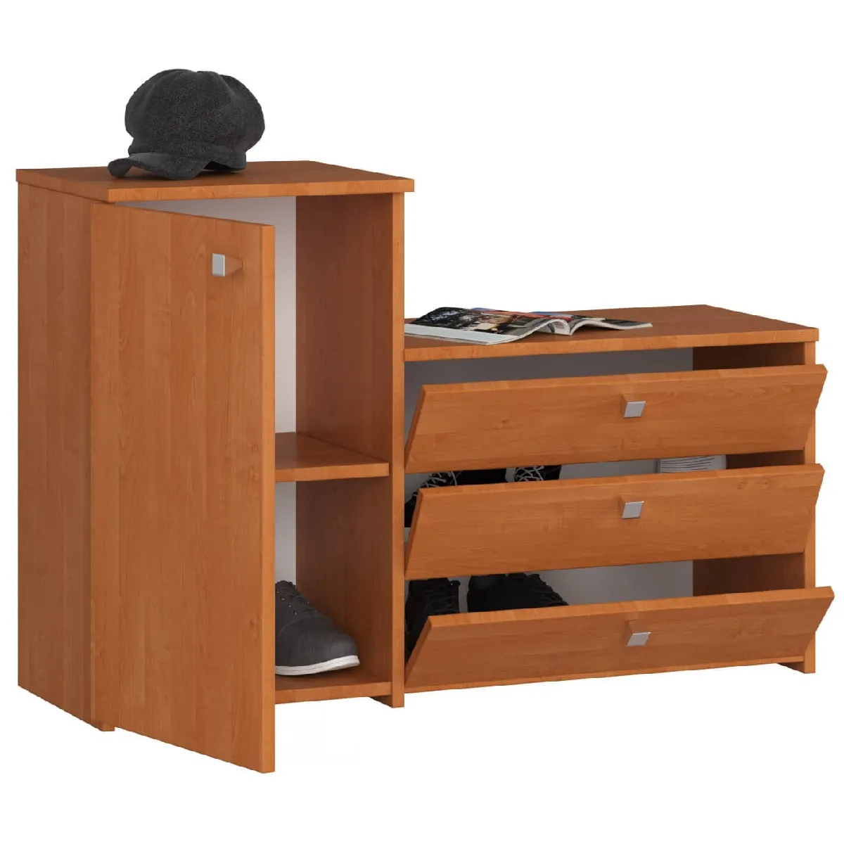 Les trois abattants accueillent chaussures et accessoires sur deux étagères intérieures dédiées, utiles pour séparer le quotidien des pièces saisonnières. La conception fermée aide à maintenir l'entrée visuellement ordonnée, tout en offrant un accès rapide sans fouiller. Le meuble se pose au sol et s'utilise comme point de dépôt pour chapeaux ou gants, ce qui facilite la préparation des départs. Le format compact limite l'empreinte au sol pour préserver le passage.