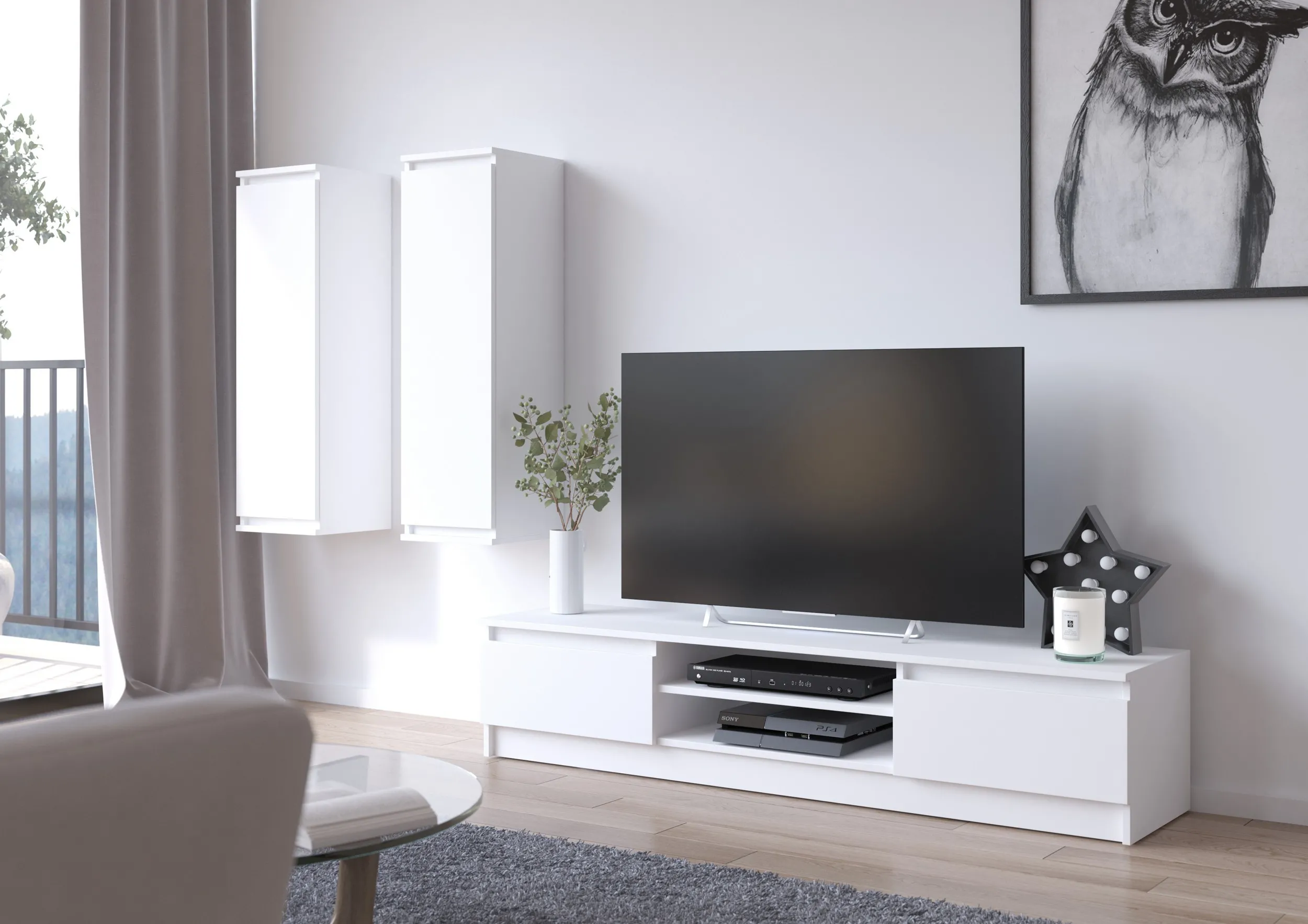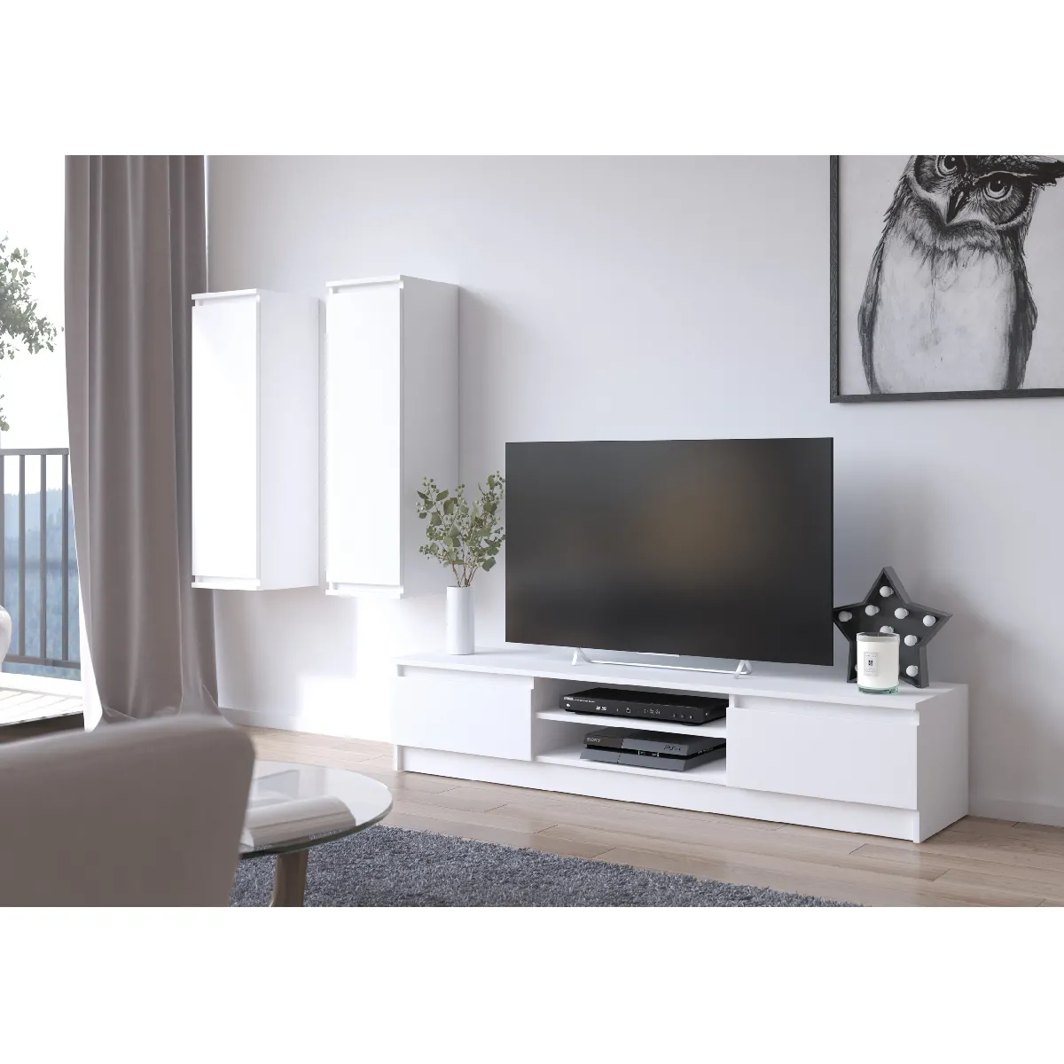 Le meuble TV propose un large plateau pour accueillir l'écran et des éléments décoratifs, complété par des compartiments latéraux fermés qui aident à préserver un aspect ordonné. Les deux armoires murales renforcent la capacité de rangement en hauteur, libérant la zone au sol pour une circulation fluide. Grâce à une forme rectangulaire et des façades en blanc mat, l'ensemble s'intègre dans un style moderne, en particulier là où la sobriété visuelle est recherchée. Les dimensions compactes facilitent l'installation dans des pièces de taille réduite.