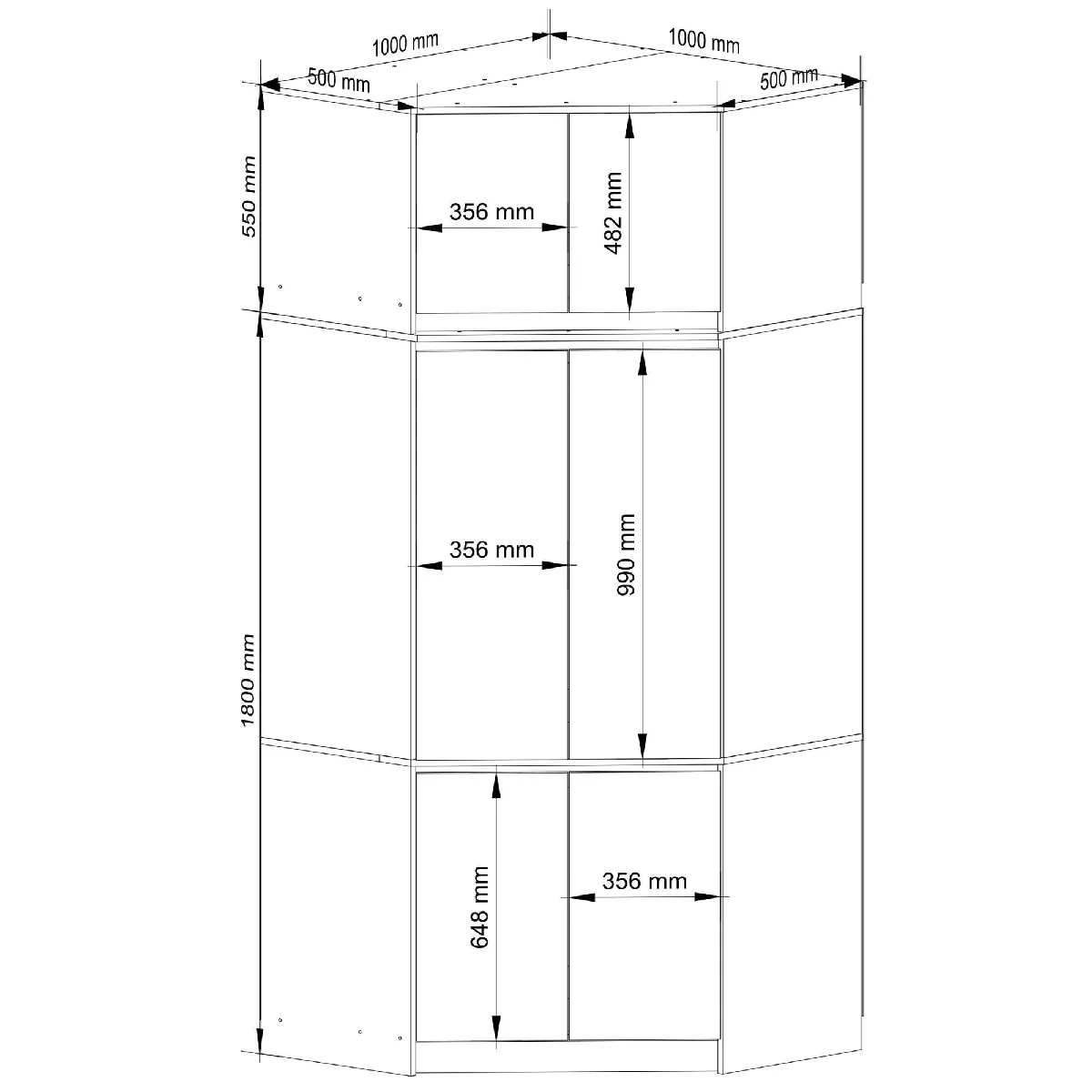 L’armoire d’angle de cuisine Akord se compose de deux parties distinctes : la partie inférieure, équipée de quatre portes battantes, offre quatre étagères et une tringle pour suspendre vos ustensiles ou torchons, permettant un rangement optimal. Le surmeuble supérieur, fermé par deux portes, est idéal pour organiser les petits accessoires grâce à trois étagères supplémentaires. Avec ses dimensions compactes (largeur 100 cm, hauteur 235 cm, profondeur 50 cm), ce meuble offre une grande capacité de rangement tout en s’adaptant aux cuisines de toutes tailles.