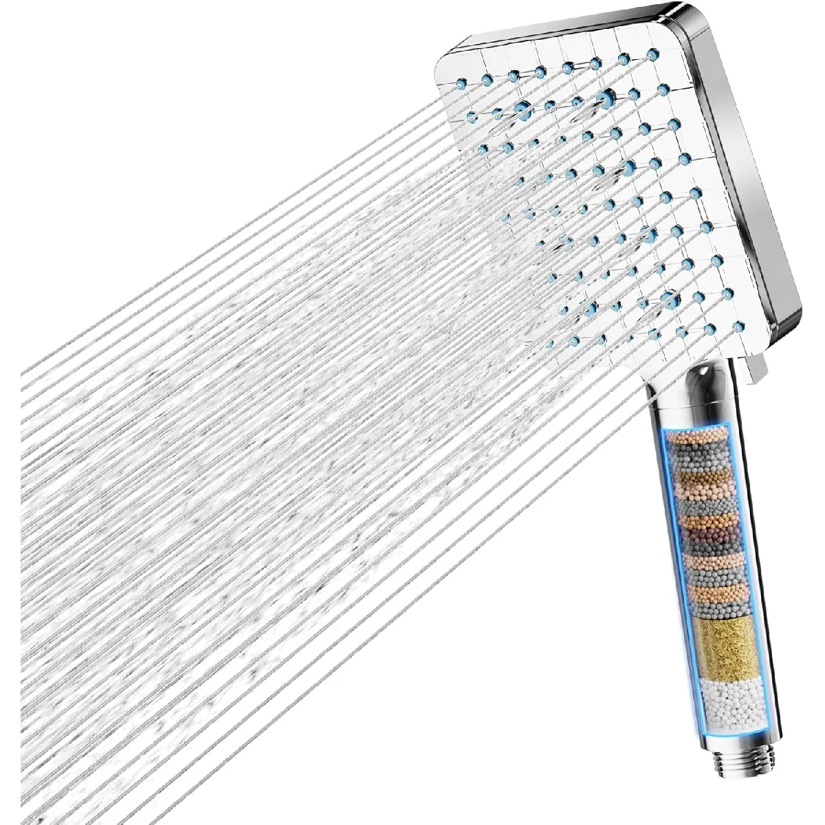 Ce pommeau de douche carré chromé intègre un système de filtration amélioré à 20 étapes combinant KDF, sulfite de calcium et billes minérales pour réduire efficacement le chlore résiduel, les métaux lourds et les impuretés. Idéal pour les régions à eau dure, il aide à apaiser les irritations cutanées et redonne douceur et brillance naturelle aux cheveux. Son sélecteur offre 6 modes de jet – pluie, massage, bulles et autres – ainsi qu’un mode de nettoyage haute pression activable d’une simple pression pour éliminer savon, cheveux et résidus. Grâce à une structure interne optimisée et à des buses en silicone régulièrement espacées, il garantit une pression puissante et stable tout en économisant l’eau. Doté d’une large tête chromée résistante à la chaleur et à l’usure, il allie durabilité et élégance moderne. L’installation universelle G1/2 se fait en quelques secondes et les buses autonettoyantes assurent un entretien facile, idéal pour l’eau dure.