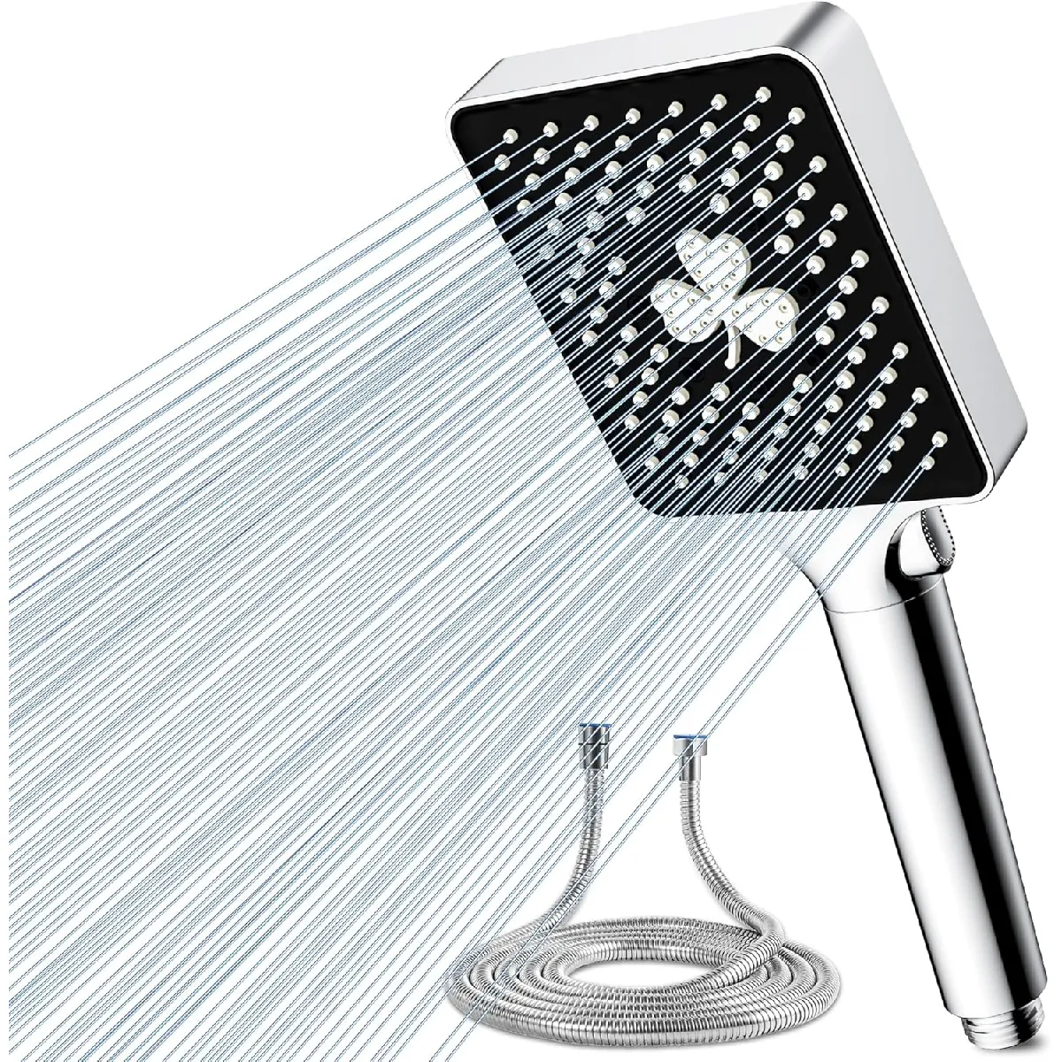 Transformez votre routine de douche avec ce pommeau carré noir moderne de 27?×?10,5?cm, livré avec tuyau. Sa technologie de pressurisation microporeuse offre un débit puissant même en faible pression, pour une douche de pluie luxueuse et uniforme. Grâce à son bouton ergonomique antidérapant, changez facilement entre ses six modes de pulvérisation adaptés à tous les besoins : douche quotidienne, bain des animaux ou nettoyage. Fabriqué en ABS de haute qualité avec finition polie multicouche, il est durable, résistant à la corrosion et à la décoloration. Son design inspiré du trèfle ajoute élégance et style à votre salle de bain. Universel et portable, il se connecte facilement à la plupart des tuyaux de douche standard, pour une installation rapide et simple.