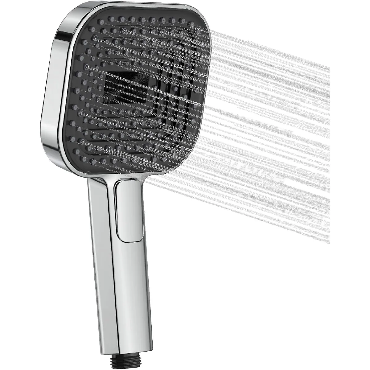 Ce pommeau de douche carré chromé de 14,5 cm offre une grande surface pour une distribution uniforme de l’eau et une couverture complète du corps. Il dispose de trois modes de pulvérisation – pluie, massage et mixte – facilement sélectionnables par un seul bouton grâce à la technologie AirMix, qui assure un jet puissant et doux tout en réduisant la consommation d’eau. Fabriqué en ABS et silicone de haute qualité, avec buses anti-calcaire, il résiste à la corrosion et aux hautes températures pour une durabilité optimale. Son montage mural sans outil et son raccord standard G½ permettent une installation rapide. Design moderne et ergonomique, il combine confort, performance et économie d’eau pour toutes les salles de bains.