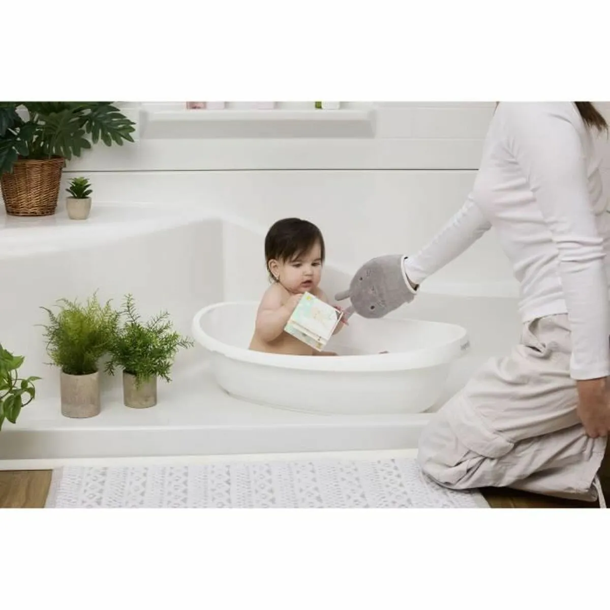 Le design blanc taupe crée une présentation sobre qui s'accorde au mobilier de salle de bain et reste agréable au quotidien. La cuve accueille l'enfant dès 0 mois, offrant un volume suffisant pour rincer sans gaspiller d'eau. Les bords étudiés favorisent une prise en main sûre lors du vidage et du transport, tandis que la surface interne se rince rapidement pour rester propre. Cet ensemble permet d'établir une routine régulière axée sur le confort, l'hygiène et la facilité d'entretien.
