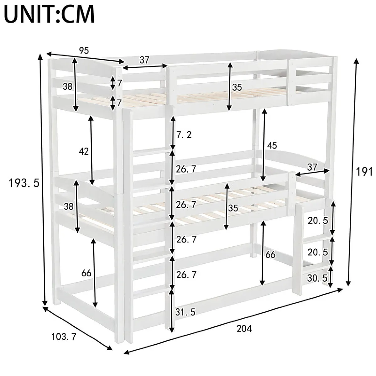 Ce lit superposé triple de taille simple est fabriqué avec un cadre en pin de haute qualité, de sorte que ce lit superposé est robuste et solide et peut résister à lépreuve du temps. Sommiers massifs pour les lits supérieurs et moyens afin de garantir que vous dormiez dans une sécurité et une stabilité absolues. Pas besoin de sommier tapissier ou de fondations.