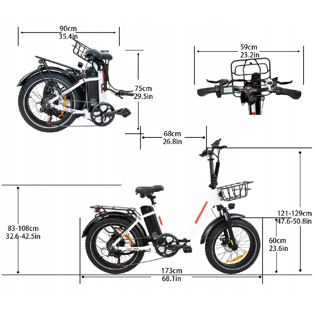 Les pneus tout - terrain 20"×4.0 affrontent lasphalte, la neige ou les sentiers. Les 7 vitesses Shimano sadaptent à tous les terrains (montées douces, descentes rapides). Et il se plie en 2 secondes : rangez - le dans le coffre, emportez - le au bureau, pratique pour la vie urbaine !