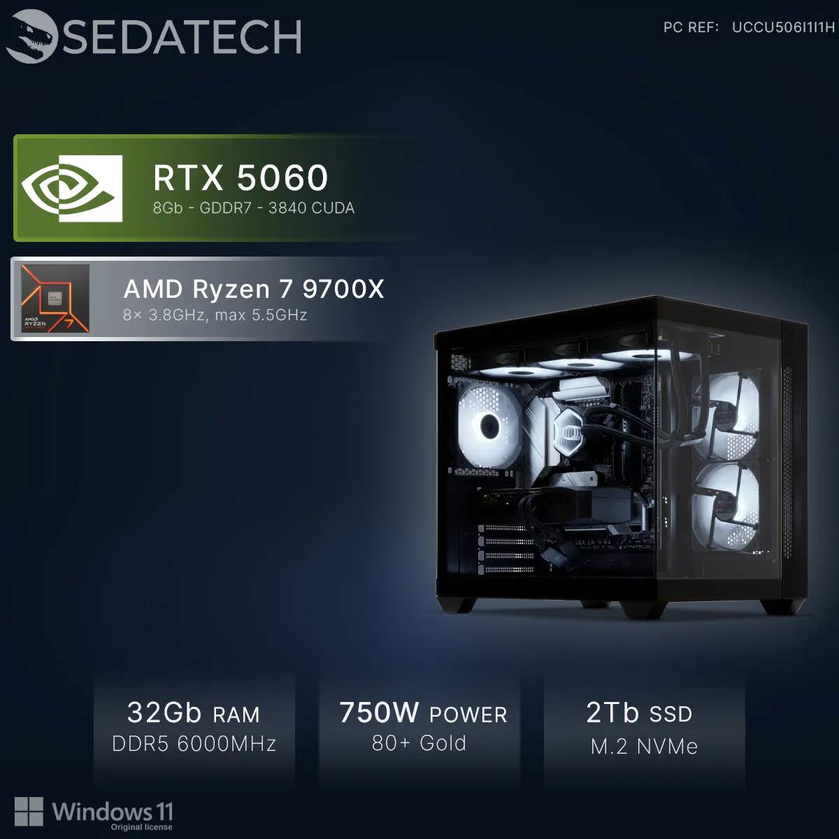Sedatech PC Gamer Aquarium • AMD Ryzen 7 9700X • RTX5060 • 32Go DDR5 • 2To SSD M.2 • Windows 11