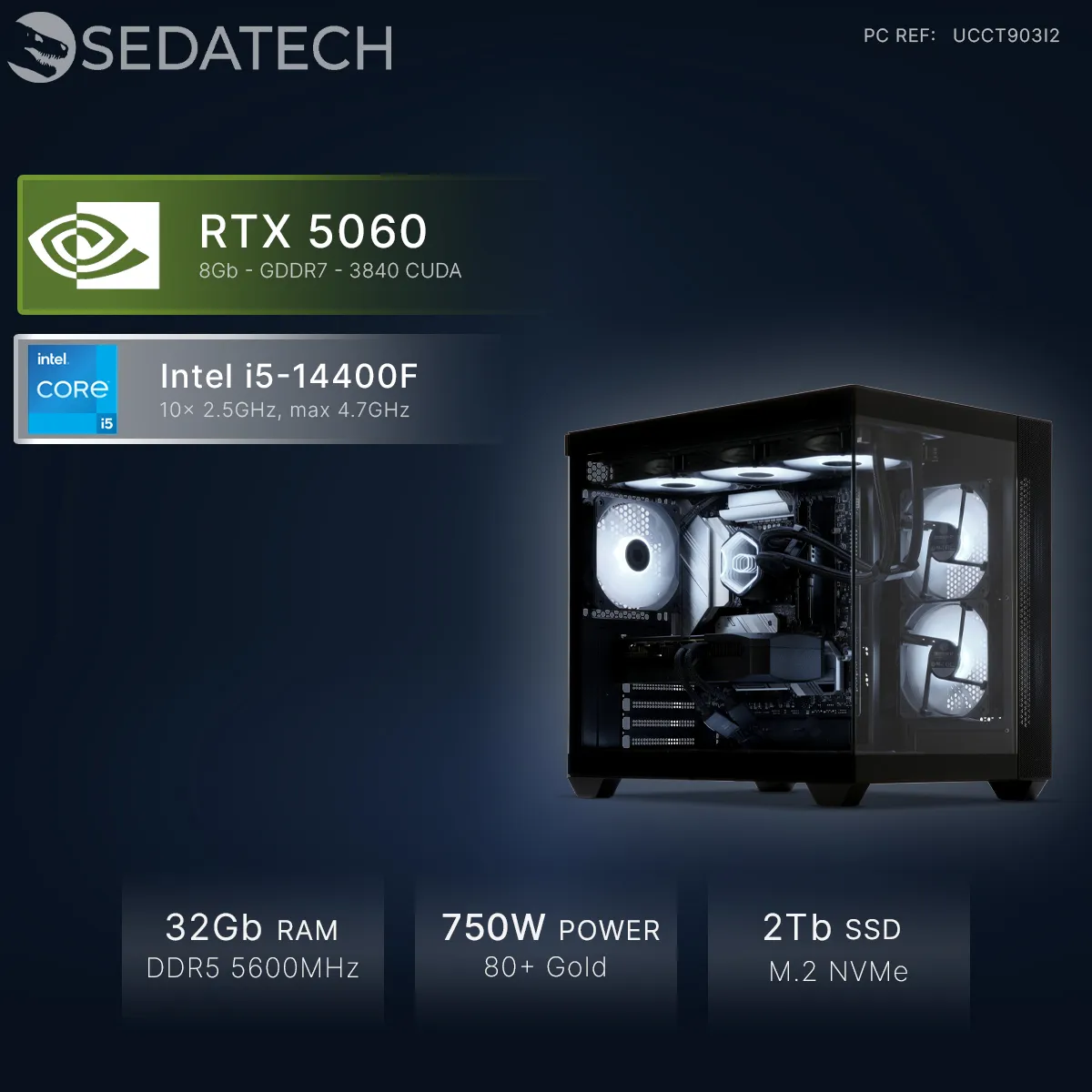 Sedatech PC Gamer, Intel i5-14400F, RTX5060, 32Go DDR5, 2To SSD, sans OS