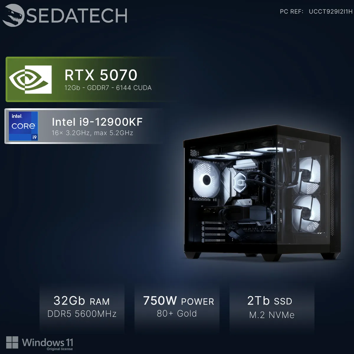 Sedatech PC Gamer Aquarium • Intel i9-12900KF • RTX5070 • 32Go DDR5 • 2To SSD M.2 • Windows 11 |