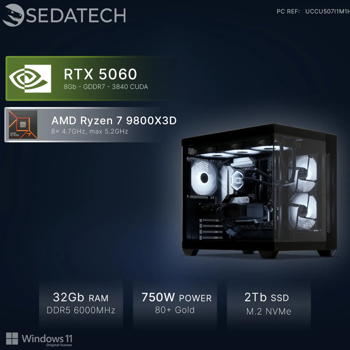 Sedatech Pack PC Gamer, AMD Ryzen 7 9800X3D, RTX5060, 32Go DDR5, 2To SSD, Win 11, Ecran 27''