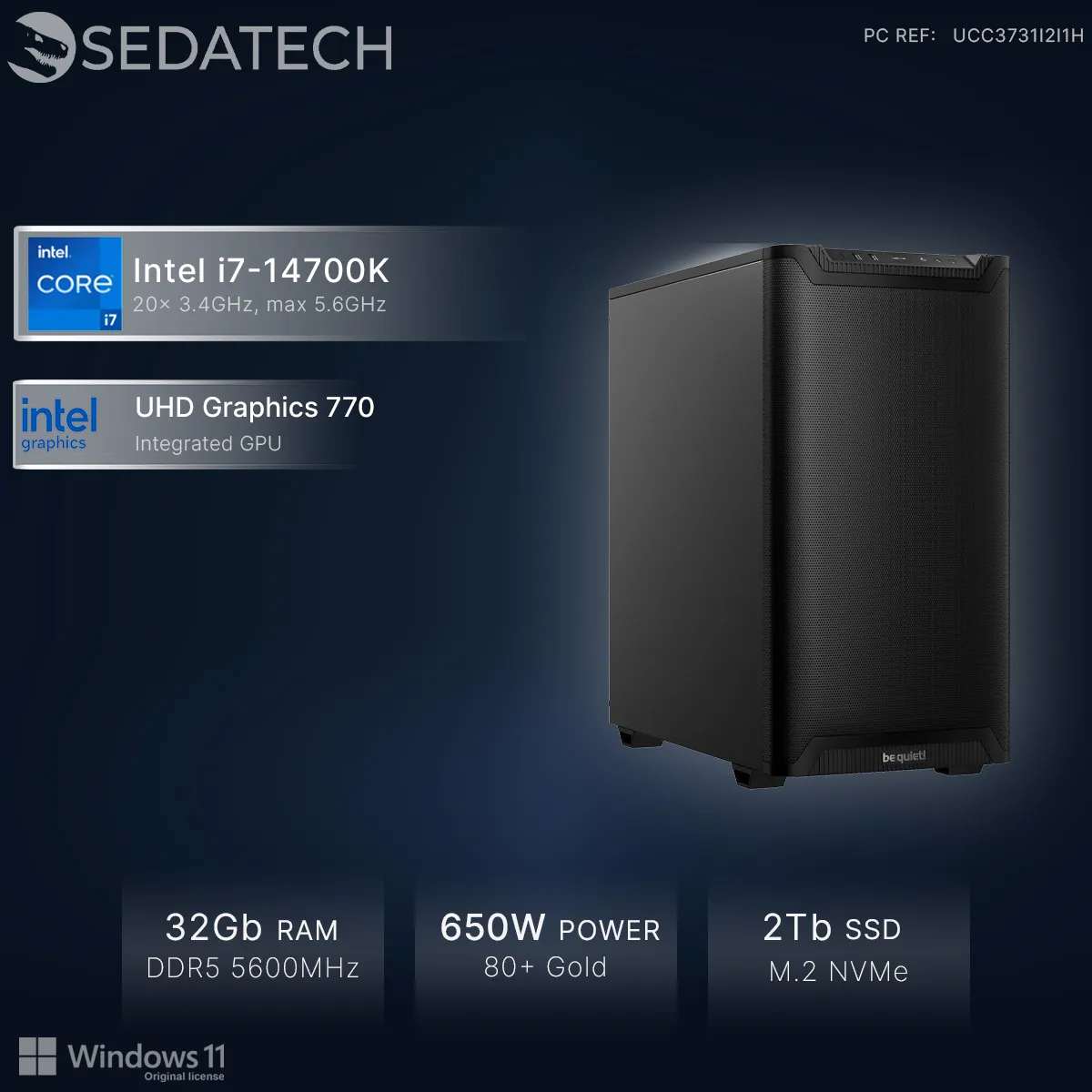 Commentaire vendeur : Sedatech Workstation Quiet + Airflow • Intel i7-14700K 20x 3.4Ghz • Intel UHD Graphics 770 • 32Go DDR5 • 2To SSD M.2 • WiFi • Bluetooth, USB C • Windows 11 • Unité centrale