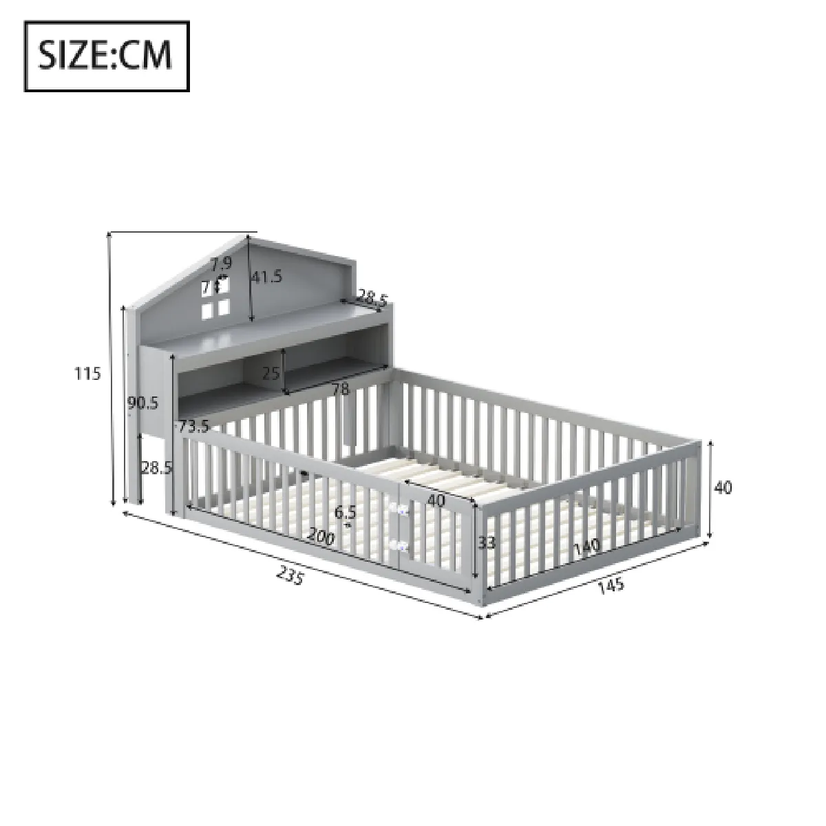 Lit enfant 140x200 cm, sommier en forme de maison, avec étagères et espace de rangement, barrière de sécurité et porte, sommier à lattes, en bois, gris, sans matelas