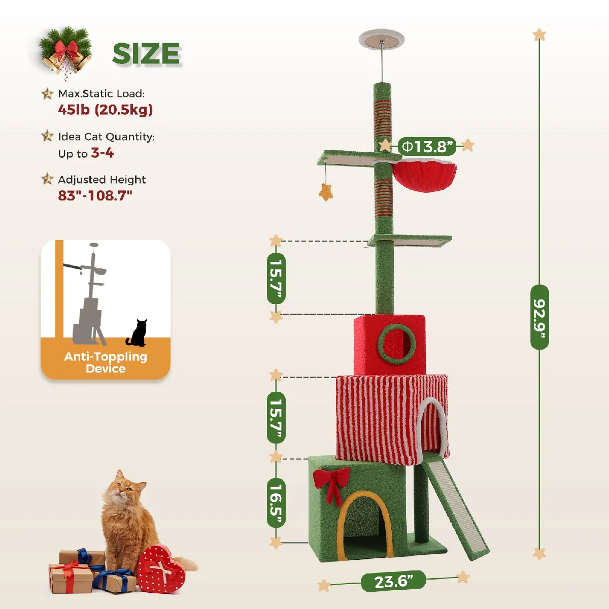 Design spacieux pour jeux & siestes : Cet arbre à chat du sol au plafond (jusquà 276 cm) est idéal pour grimper, sétirer et observer la pièce. Il comprend trois condos empilés façon boîtes cadeaux et un hamac circulaire de 35 cm pour se détendre en hauteur, offrant un refuge multi-niveaux que les chats adorent explorer. Un véritable paradis félin de Noël en hauteur.
