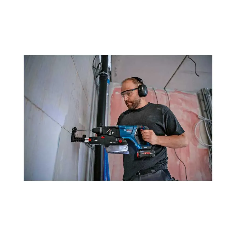 Le GDE 28 D Professional offre une aspiration intégrée pour opérations de perçage et de perforation, limitant la dispersion des particules à la source. Son installation en un seul clic avec rails de montage simplifie la mise en place sur les foreuses compatibles, y compris des modèles tels que GBH 18V-28 DC. Adapté aux forets jusqu'à 28 mm, il accepte une profondeur de perçage maximale de 100 mm et des forets jusqu'à 265 mm avec rallonge. Le boîtier en plastique de 0,8 kg reste maniable sur chantier comme en atelier.
