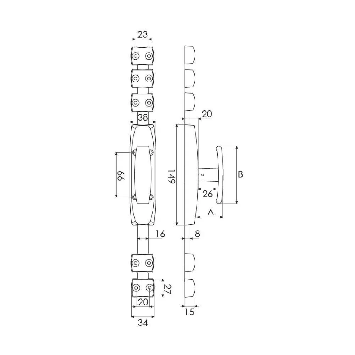 - Dimensions principales : longueur plaque principale 149 mm, longueur intérieure de la poignée 66 mm, largeur plaque 38 mm, épaisseur plaque 8 mm