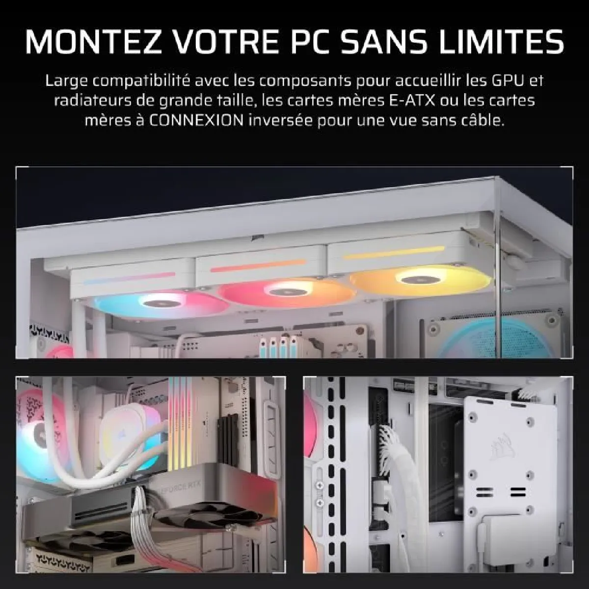Le boîtier CORSAIR 3500X LX-R présente une esthétique épurée en blanc combinée à des panneaux en verre trempé, offrant un rendu premium et une mise en valeur des composants et des éclairages RGB.