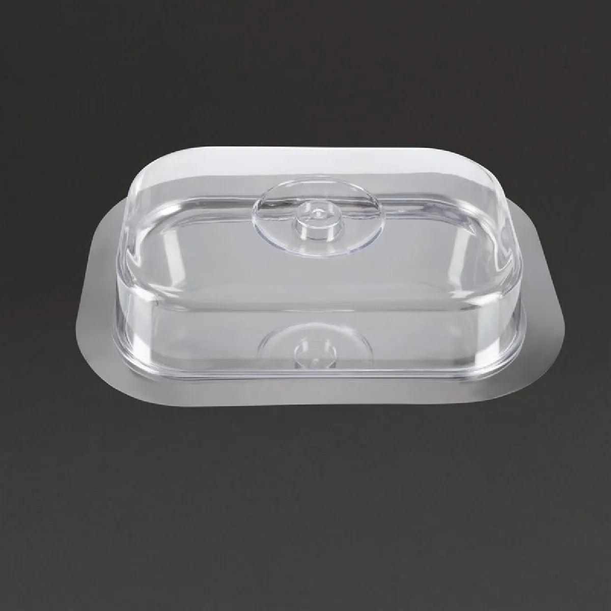 Plateau en acier inoxydable finition miroir avec couvercle LURAN transparent durable.Marque: APS. Dimensions: 310(L) x 90(P)mm