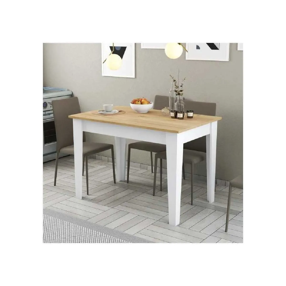 Les panneaux mélaminés et le plateau imitation bois de 18 mm forment une structure stable avec finition uniforme. Un cadre sous plateau contribue à la répartition des charges et à la stabilité d'ensemble, complété par quatre pieds coniques carrés. Les proportions de 110 x 72 x 75 cm conviennent à un usage pour 4 personnes, avec une surface rectangulaire à bord droit adaptée aux besoins courants. Livrée en un colis, l'installation nécessite un montage simple, afin d'obtenir une table au style moderne, pensée pour la cuisine comme pour la salle à manger.