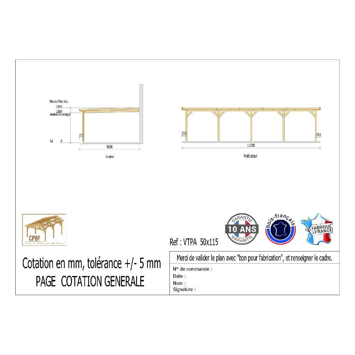 La charpente traditionnelle moisée forme une ossature fiable et durable adaptée aux grandes portées, assurant une répartition homogène des charges. L'implantation adossée facilite le positionnement contre un mur porteur et permet d'optimiser la circulation et la couverture de plusieurs places. Le bois Douglas, naturellement adapté aux usages extérieurs, confère une tenue mécanique appréciable et une esthétique chaleureuse. Les dimensions généreuses autorisent le stationnement de 2 voitures et plus, tout en laissant un passage aisé pour ouvrir les portières et accéder au coffre.