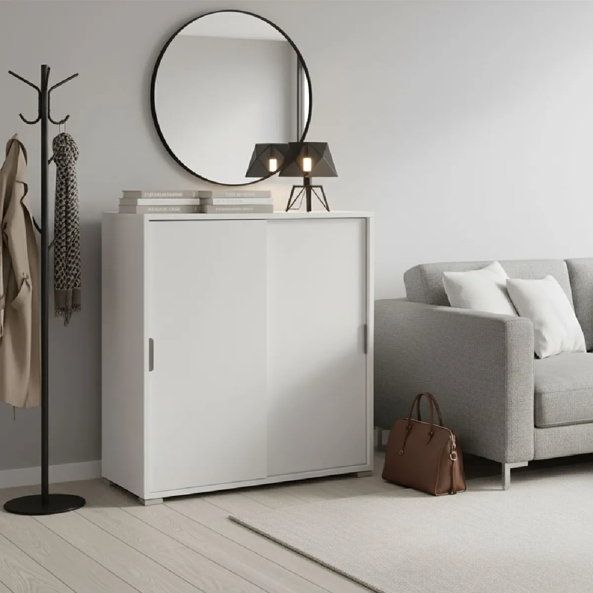 DIMENSIONS : L75 × H85 × P38 cm. La profondeur réduite et les portes coulissantes qui n'envahissent pas le passage sont une solution pratique pour les couloirs et les espaces étroits. La largeur de 75 cm assure une bonne capacité tout en restant compacte. Le plateau supérieur peut accueillir un plateau à café, une imprimante compacte, un routeur ou un organiseur de courrier.