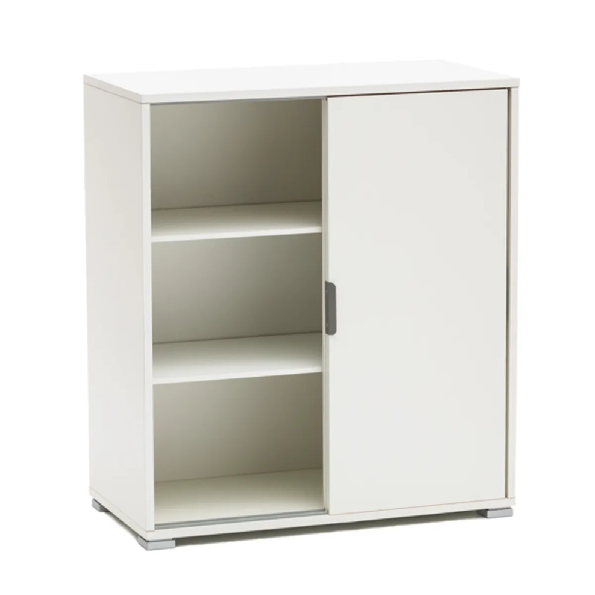 INTÉRIEUR ORGANISÉ : le meuble est équipé de 2 portes coulissantes sur rail pour une ouverture linéaire sans encombrement et 2 étagères réglables sur toute la largeur pour moduler les hauteurs et créer jusqu'à 3 niveaux de rangement. Les poignées intégrées offrent une prise confortable ; le glissement fluide est pensé pour un usage quotidien.