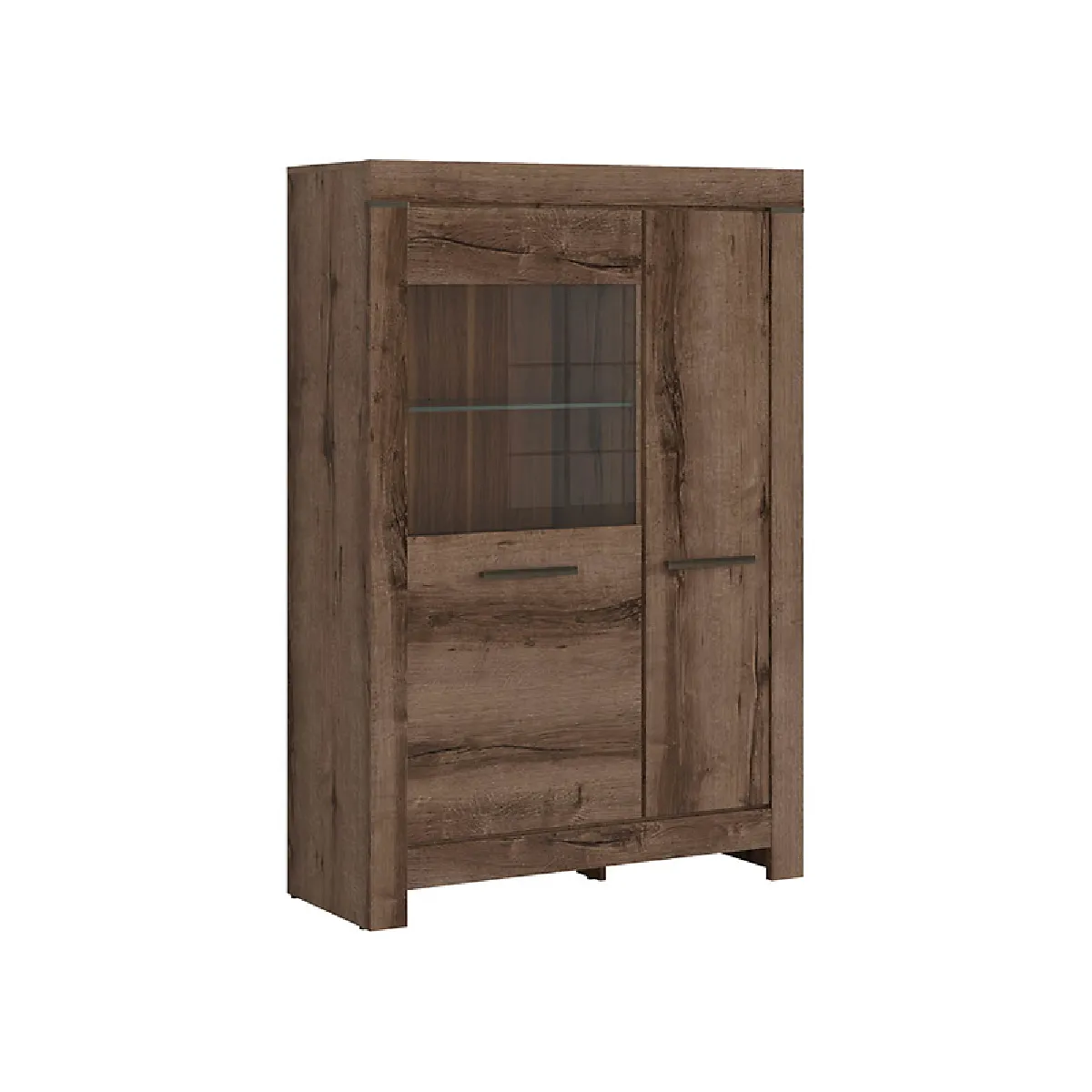 La vitrine propose un espace d'exposition protégé par du verre trempé, idéal pour la vaisselle, les collections ou des livres choisis. L'éclairage LED placé sous les étagères en verre souligne les volumes et apporte une mise en scène douce des objets exposés. Le coloris chêne marron foncé s'associe facilement aux teintes neutres et aux matériaux naturels pour une continuité visuelle dans la pièce.