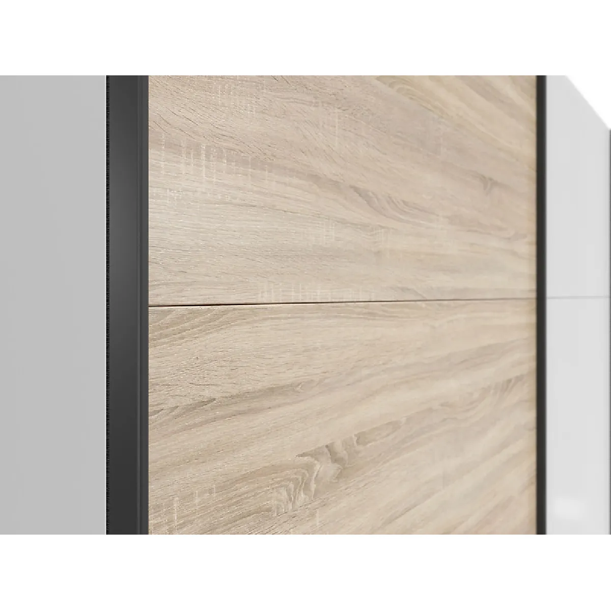 Le vaste volume intérieur facilite l'organisation de la garde-robe grâce à deux portes coulissantes fluides et un aménagement modulable. Avec ses dimensions de 220 x 60 x 195,5 cm, ce modèle s'intègre dans une chambre adulte tout en offrant une capacité de rangement optimisée pour vêtements et accessoires. La façade Blanc brillant/Chêne sonoma s'accorde à un intérieur moderne sans surcharge visuelle. La structure en panneaux de particules et MDF, complétée par un revêtement mélaminé et des finitions métallisées, apporte stabilité et entretien simplifié au quotidien. L'ensemble crée un rangement fonctionnel et soigné.