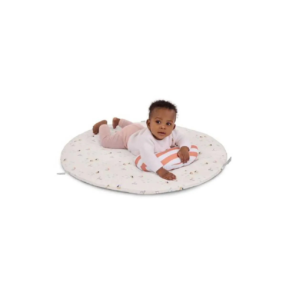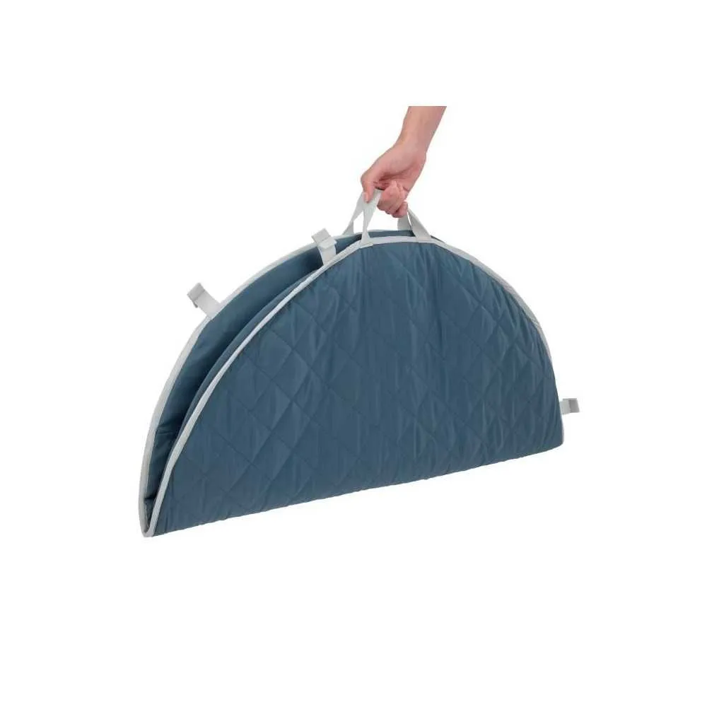 Le tapis offre une surface matelassée et rembourrée qui soutient le corps du nourrisson pour les temps sur le ventre, l'allongé et les premières positions assises. Sa conception réversible avec deux faces contrastées dont un décor marin permet d'alterner les stimulations visuelles et de varier l'ambiance. L'arche en bois SlimFold pliable sans outils s'installe rapidement et reste accessible depuis la position allongée, afin que le bébé atteigne facilement les jouets. Les deux poignées intégrées facilitent le pliage en demi-lune pour ranger et transporter l'ensemble sans égarer les accessoires.