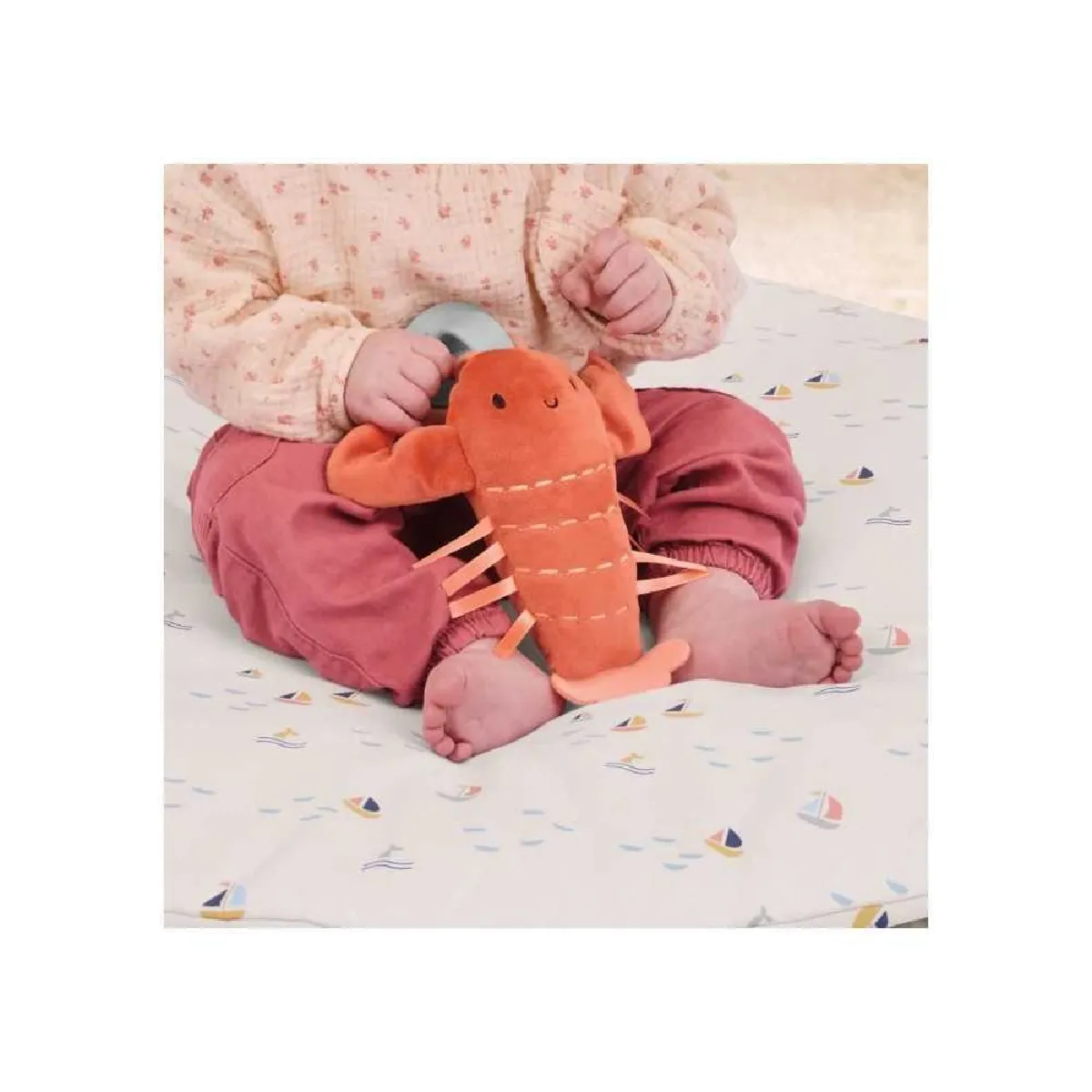 - 5 jouets détachables : homard carillon, anneau en bois à tirette, hochet baleine, miroir bouée, dollar des sables en silicone