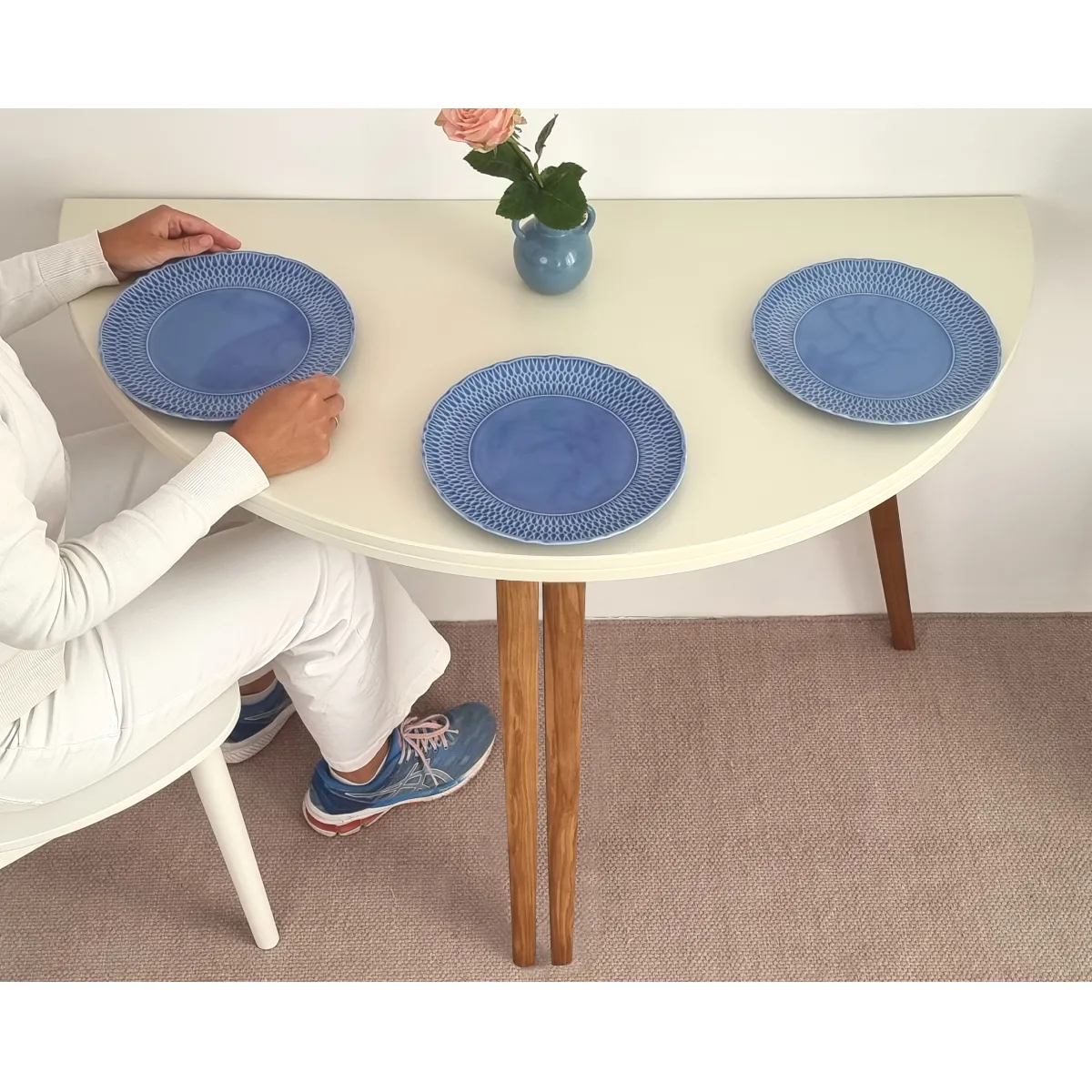 Sa forme semi-circulaire permet de l'utiliser comme petite table, console extensible, plan de travail supplémentaire en cuisine ou encore comme table d'entrée pour y disposer des objets décoratifs dans la salle à manger ou le hall.