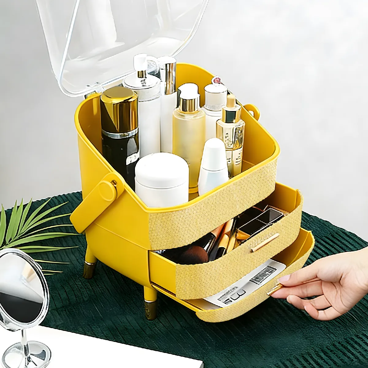 le compartiment supérieur transparent et scellé vous permet de voir vos fonds de teint, palettes ou soins d'un coup d'oeil, sans chercher. Les 2 tiroirs extensibles avec cloisons cachées sont parfaits pour trier les rouges à lèvres, pinceaux ou bijoux