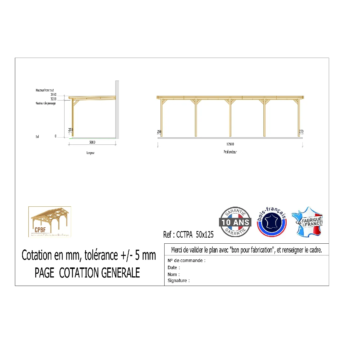 L'espace de stationnement gagne en fonctionnalité grâce à un grand abri de 63 m² au format 5 x 12,5 m, adapté aux besoins quotidiens. La structure en bois Douglas issu de nos forêts françaises offre une tenue fiable et une esthétique naturelle, idéale pour s'intégrer à divers environnements. Les charpentes traditionnelles moisées apportent une conception soignée, pensée pour la stabilité dans le temps. Le modèle adossé facilite l'implantation contre un mur porteur et optimise l'emprise au sol. Livré en teinte naturelle, il accueille une voiture et réserve de la place pour du rangement. Le kit inclut un dossier technique complet et la quincaillerie d'assemblage pour guider chaque étape.