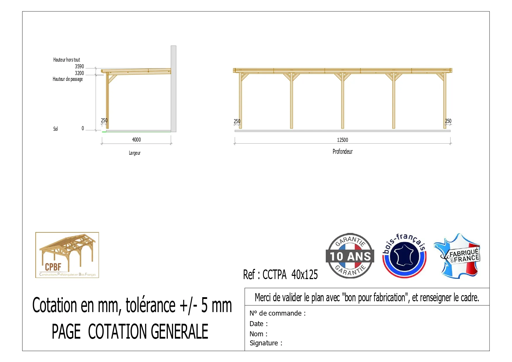 La charpente moisée en bois DOUGLAS français assure une répartition homogène des charges et une excellente tenue dans le temps. Avec une largeur de 4 m et une longueur de 12,5 m, l'espace permet d'organiser le stationnement de 2 voitures et plus ou d'intégrer des rangements latéraux. La hauteur de 3,59 m favorise une bonne circulation sous abri et l'installation d'accessoires tels que rangements muraux ou éclairage, selon vos besoins. Le modèle adossé facilite l'intégration contre un bâtiment existant pour optimiser le passage et libérer la zone de manuvre.