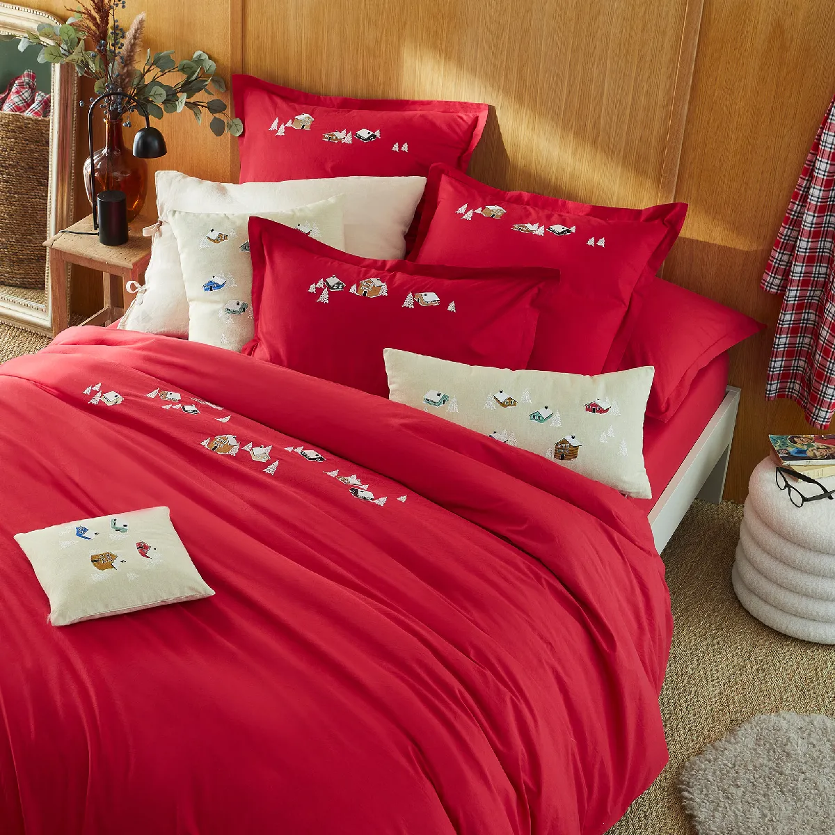 Le décor brodé aux motifs montagne et chalets apporte une touche chaleureuse à la chambre tout en restant sobre et facile à associer. Confectionnée en 100 % percale de coton, cette housse assure un contact doux et une bonne tenue au fil des lavages. La finition forme bouteille avec rabats intérieurs facilite la mise en place de la couette et limite les sorties nocturnes du garnissage. La teinte rouge souligne une ambiance hivernale inspirée des paysages alpins pour un lit accueillant au quotidien.