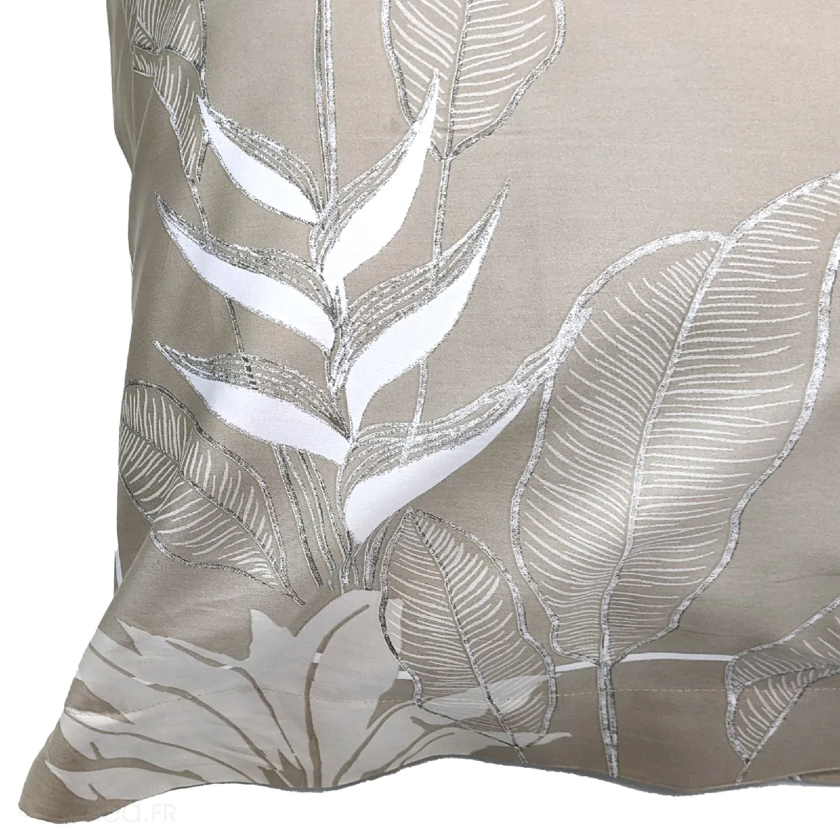 Commentaire vendeur : TAIE D'OREILLER CAYENNE beige ficelle 65x65 CMAmbiance raffinée et chic avec cette végétation luxuriante de grandes feuilles dans des tons sable sur fond beige ficelle.La collection linge de lit CAYENNE en satin de coton est appréciée pour sa qualité et sa finition, idéale pour une décoration de chambre qui vous fera plonger dans la jungle chaque soir.Taie d'oreiller carrée avec deux faces imprimées identiques, motif placé végétal tons sable sur fond beige.Finition volant plat piqué de ±7cm, forme portefeuille avec un grand rabat intérieur.Linge de lit imprimé en satin de coton avec un tissage 110 fils/cm2 très serrés pour une grande résistance et une excellente tenue. Traité Honeytouch pour vous garantir une souplesse exceptionnelle du tissu (ajout d'adoucissants lors de préparation de l'impression).Composez vous même votre parure à vos dimensions de lit grâce à tous les articles disponibles en vente à l'unité. La collection CAYENNE, certifiée OEKO-TEX est fabriquée en France.Côté technique :Matière : 100% coton longues fibres peignéesQualité : Satin de coton 110 fils/cm2 (275 TC)Couleurs garanties grand teintTraitement Honey-touch (assoupli le tissu)Forme portefeuille, rabat intérieur ±20 cmFinition volant piqué de ±7 cmDimensions 65x65 cmTaie d'oreiller carrée vendue à l'unitéFabriqué en FranceLes plus du produit :Superbe qualité de tissu très souple et beau motifs imprimés pour ce linge de lit en satin de coton.Linge de...