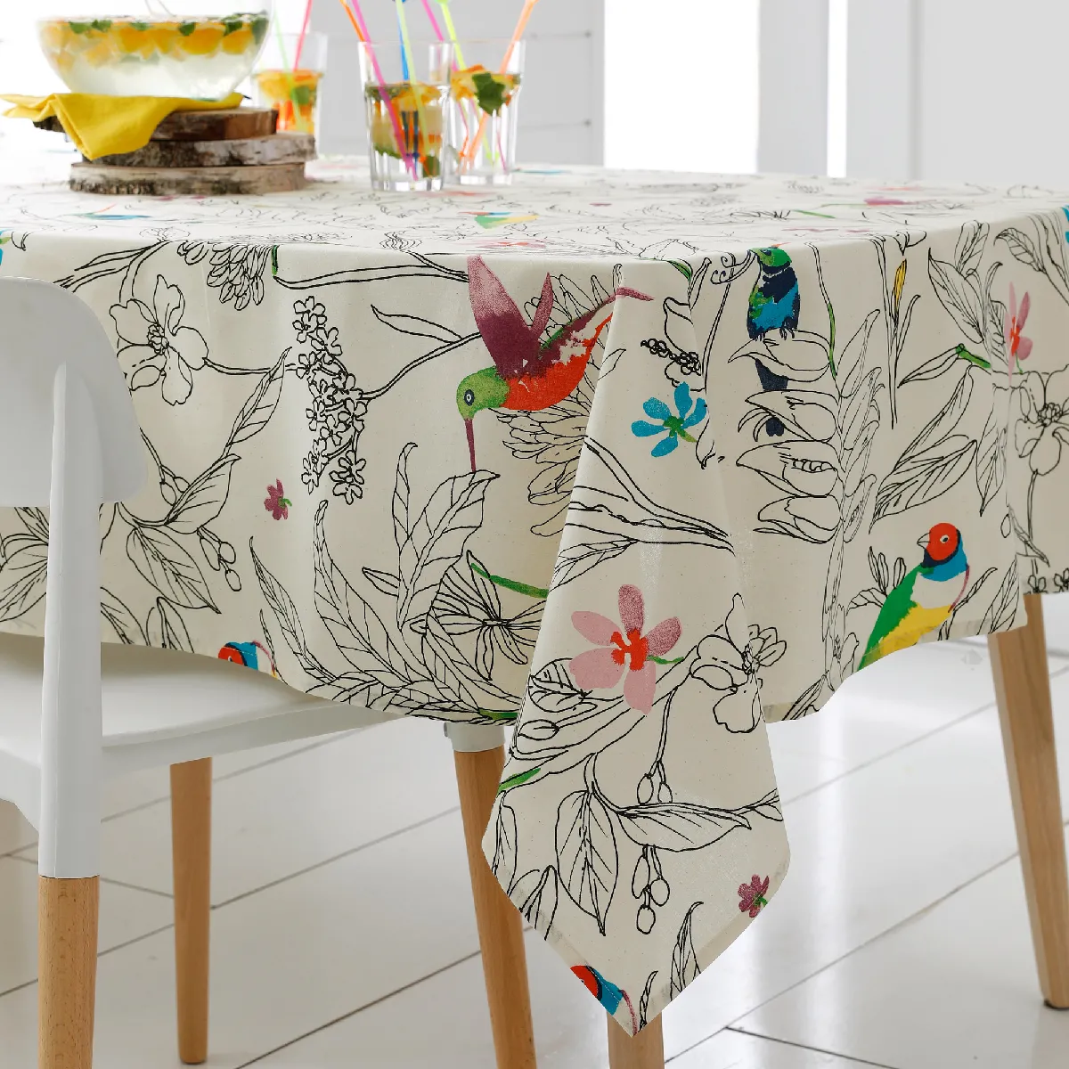 Nappe enduite rectangulaire en coton – motif tropical Colibri – anti-taches – imperméable – entretien facile à l’éponge – finition biais – fabriquée en France