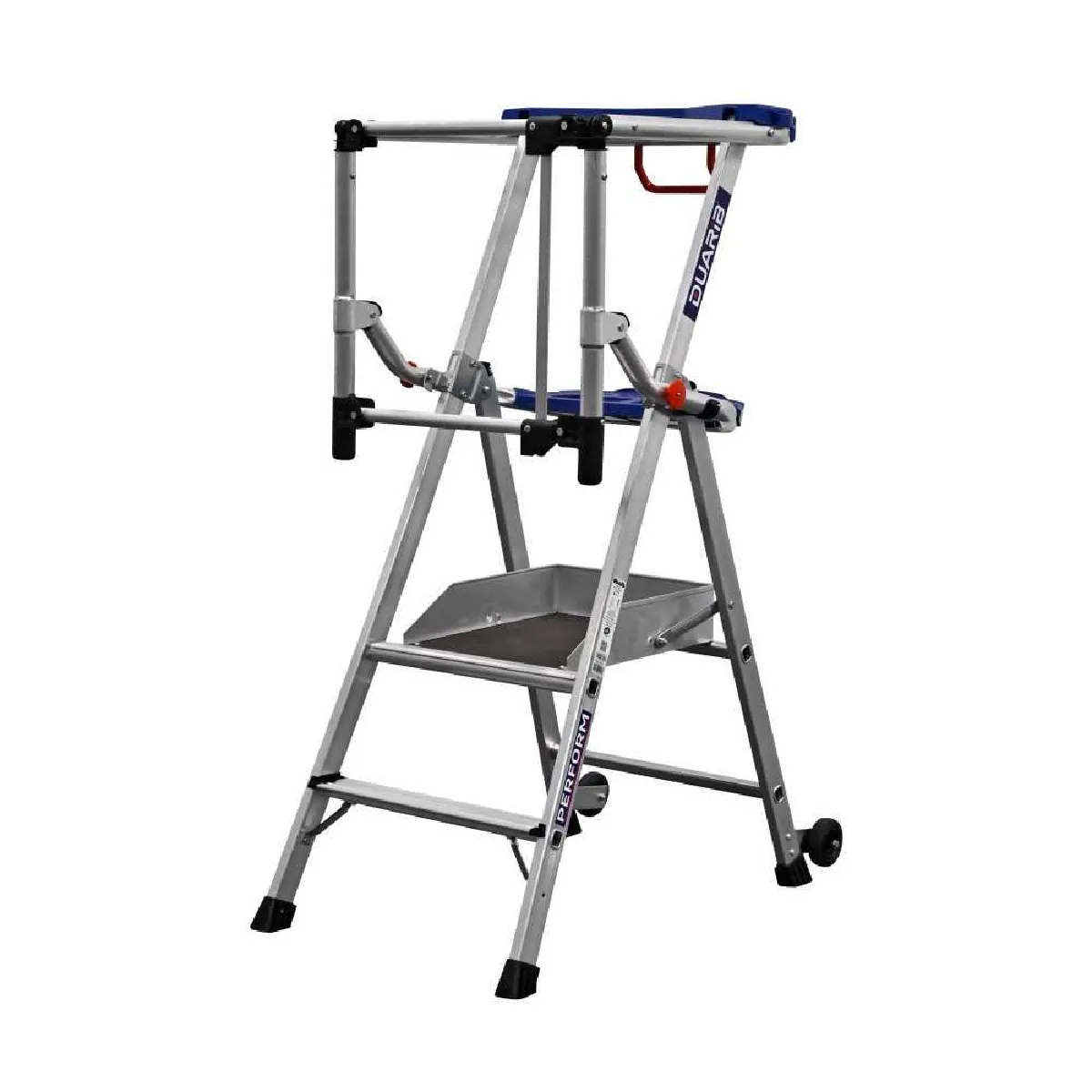 DUARIB Plateforme Perform fixe 3 marches en aluminium avec stabilisateur réglable, tablette porte-outils moulée et roues - réf. 615903