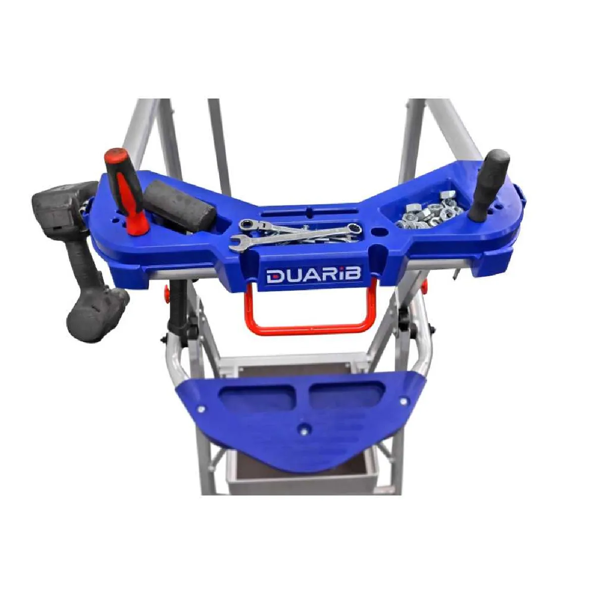 - Tablette porte-outils moulée : plateau bleu fixé au garde-corps avec compartiments, emplacements pour outils et crochet pour perceuse.