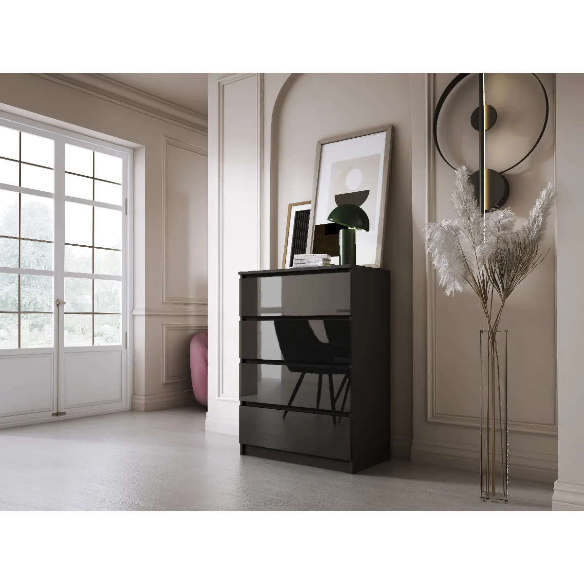 3XELIVING Commode 4 Tiroirs, Noir Mat / Noir Brillant, 70 x 39 x 101 cm