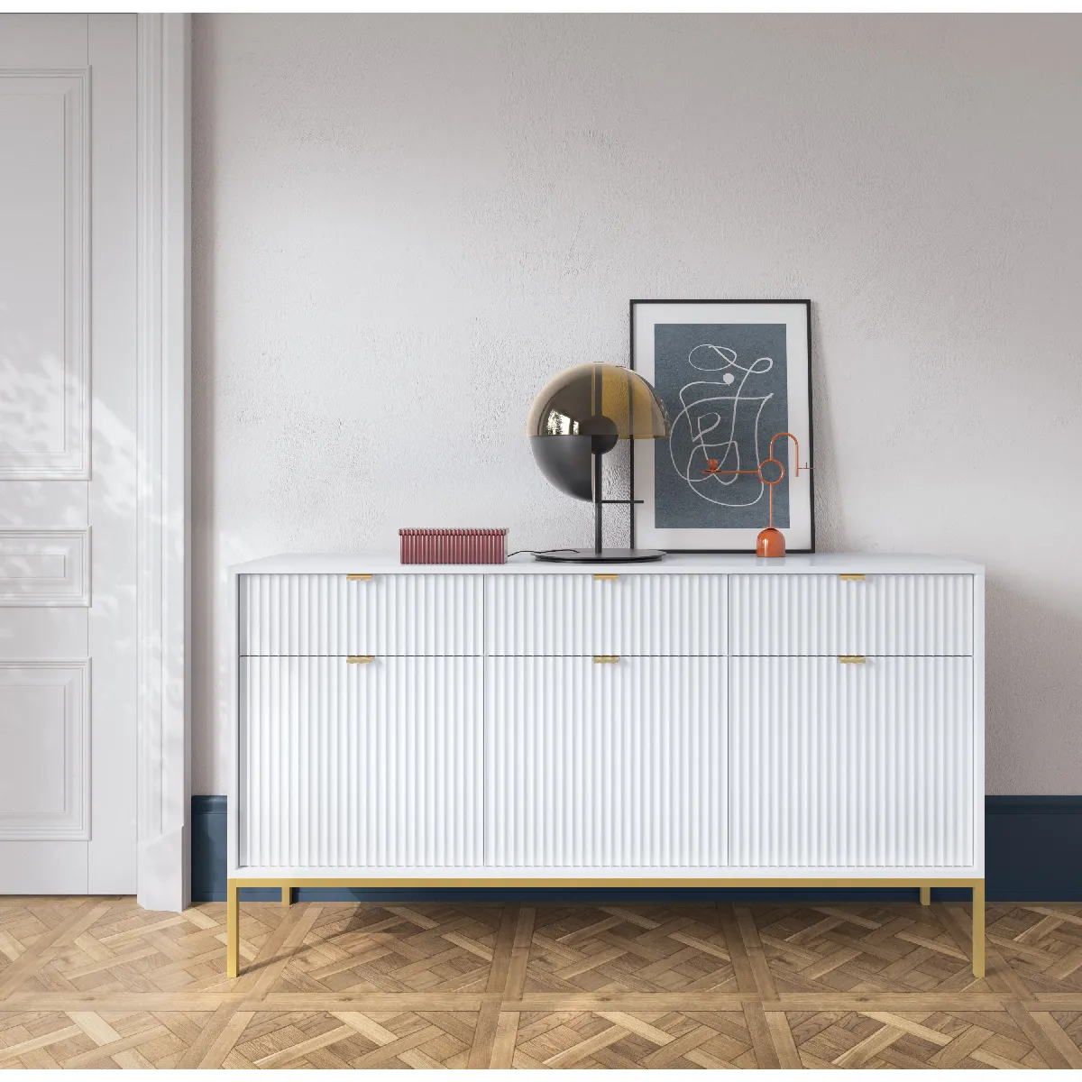 3XELIVING Commode : 3 Tiroirs, 3 Portes, Blanc, or, 154 x 83 x 39 cm, poignées dorées, |