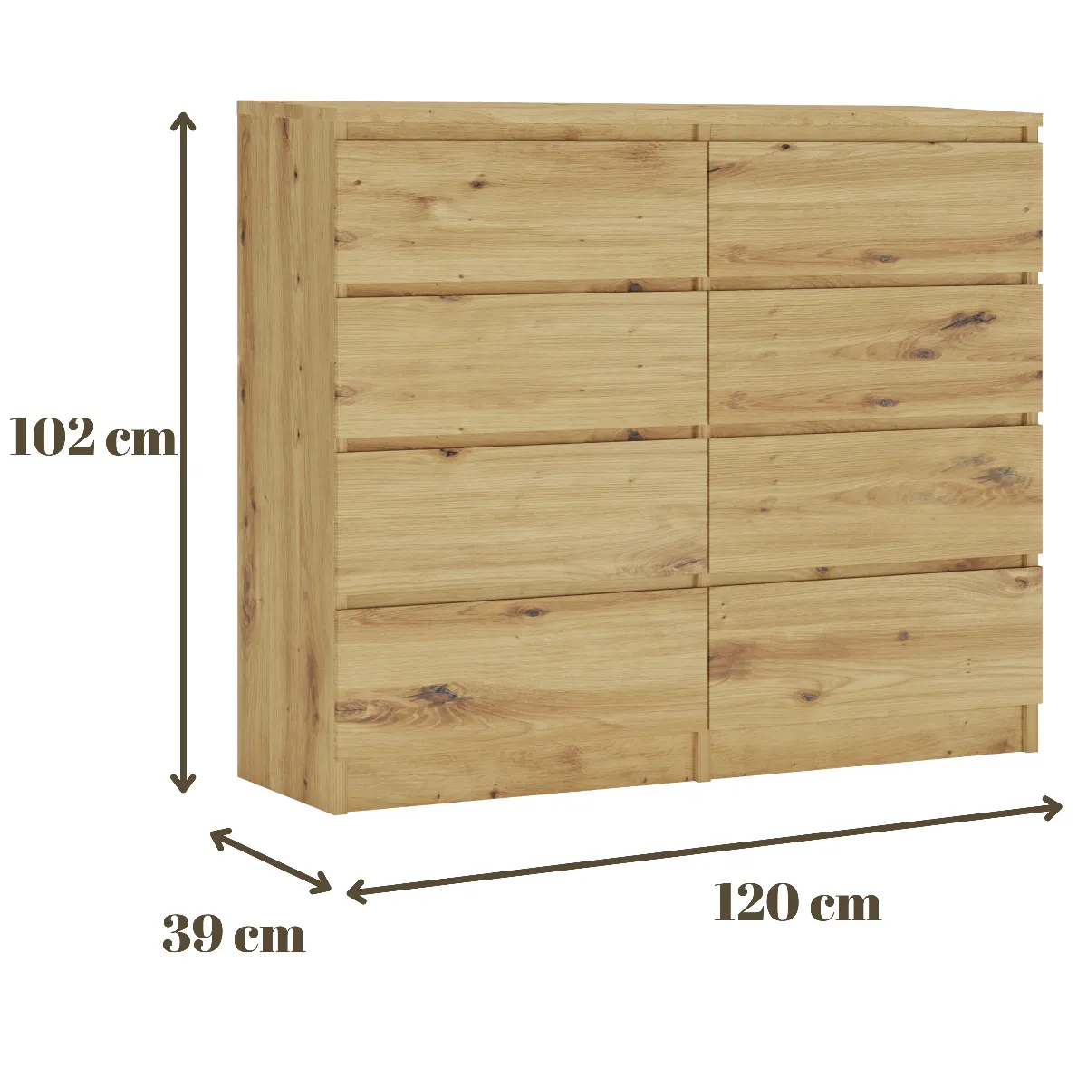 3XELIVING Commode 8 tiroirs : Chêne Artisan, 120 x 101 x 39 cm |