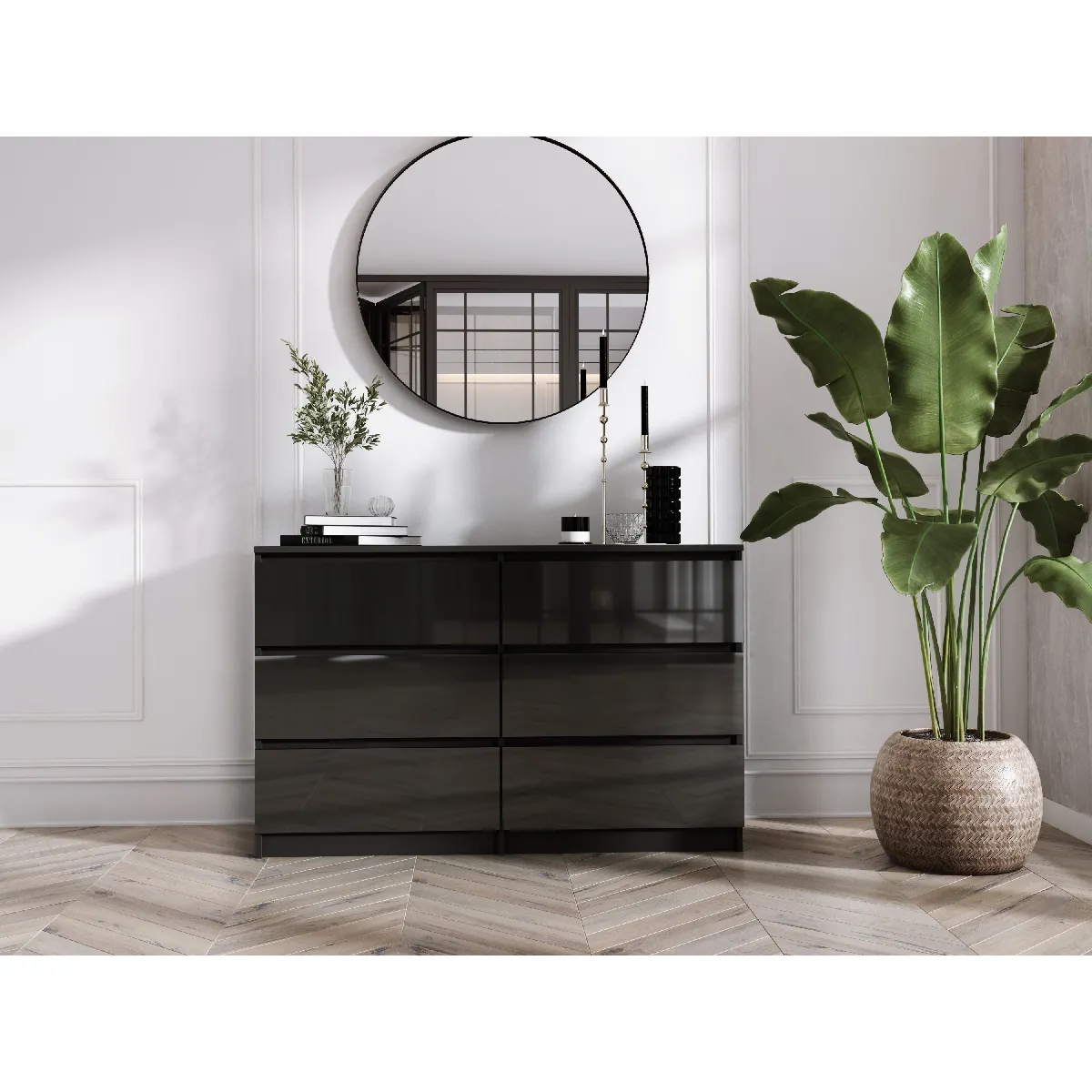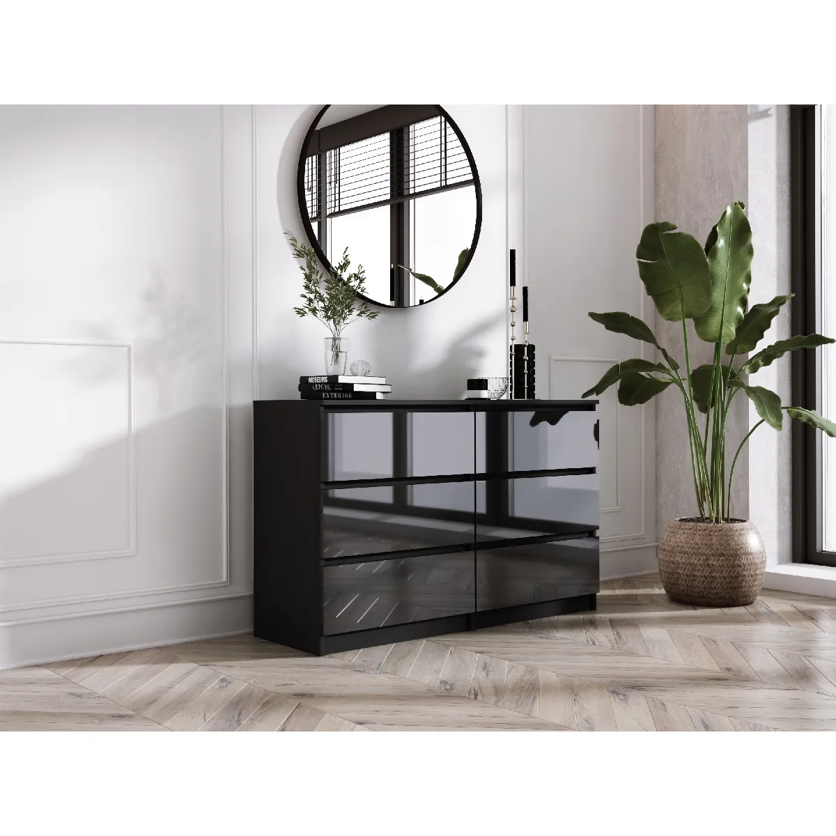 3XELIVING Commode 6 Tiroirs : Noir Mat / Noir Brillant, 138 x 39 x 79 cm