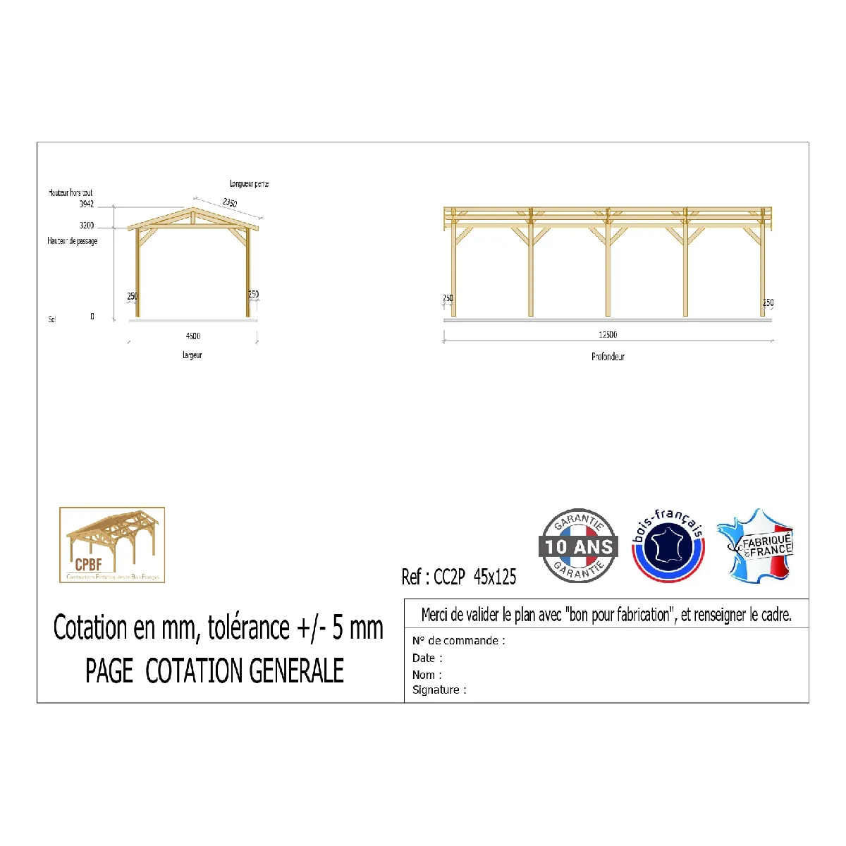 Commentaire vendeur : Charpentes fabriquées par l’entreprise CPBF qui est implantée dans le sud-ouest en Lot et Garonne (47). Bois DOUGLAS issu de nos forêts françaises. Dimensions et descriptif sous format photo ci-dessus. Charpentes traditionnelles moisées. Fourni avec : dossier technique complet (fiches conseils, fiches de montage, plan de préparation du sol), quincaillerie d’assemblage. Possibilité de fermer totalement ou partiellement les côtés de votre abri par vos soins. IMPORTANT : Pour le meilleur tarif, la livraison s'effectue en poids lourd 38T (accessibilité validé auprès des services techniques de la commune de livraison) et le déchargement est réalisé par vos soins, dé-palettisation (environ 30 minutes, prévoir 3 personnes).