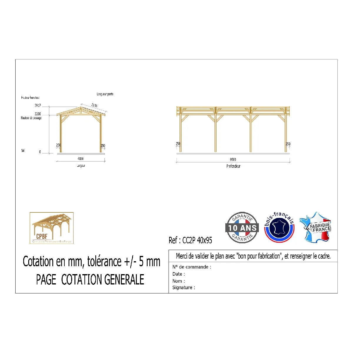 La charpente est fabriquée par CPBF, implantée dans le Lot-et-Garonne (47), avec une construction traditionnelle moisée pour une stabilité homogène. Le matériau principal est un bois DOUGLAS adapté aux environnements extérieurs, choisi pour sa tenue mécanique et sa durabilité naturelle. Avec 4 m de largeur et 9,5 m de longueur, la surface de 38 m² convient au stationnement d'une voiture et à l'organisation d'un passage latéral. La hauteur de 3,2 m facilite l'accès et le confort de manuvre, tout en s'intégrant discrètement au jardin grâce au coloris marron.