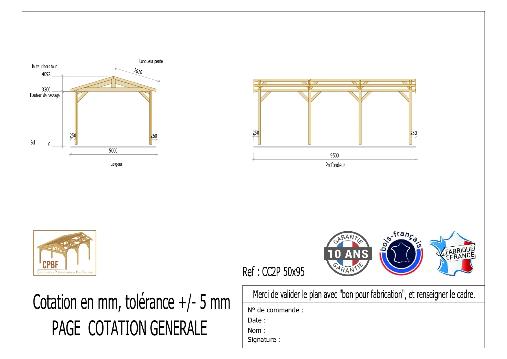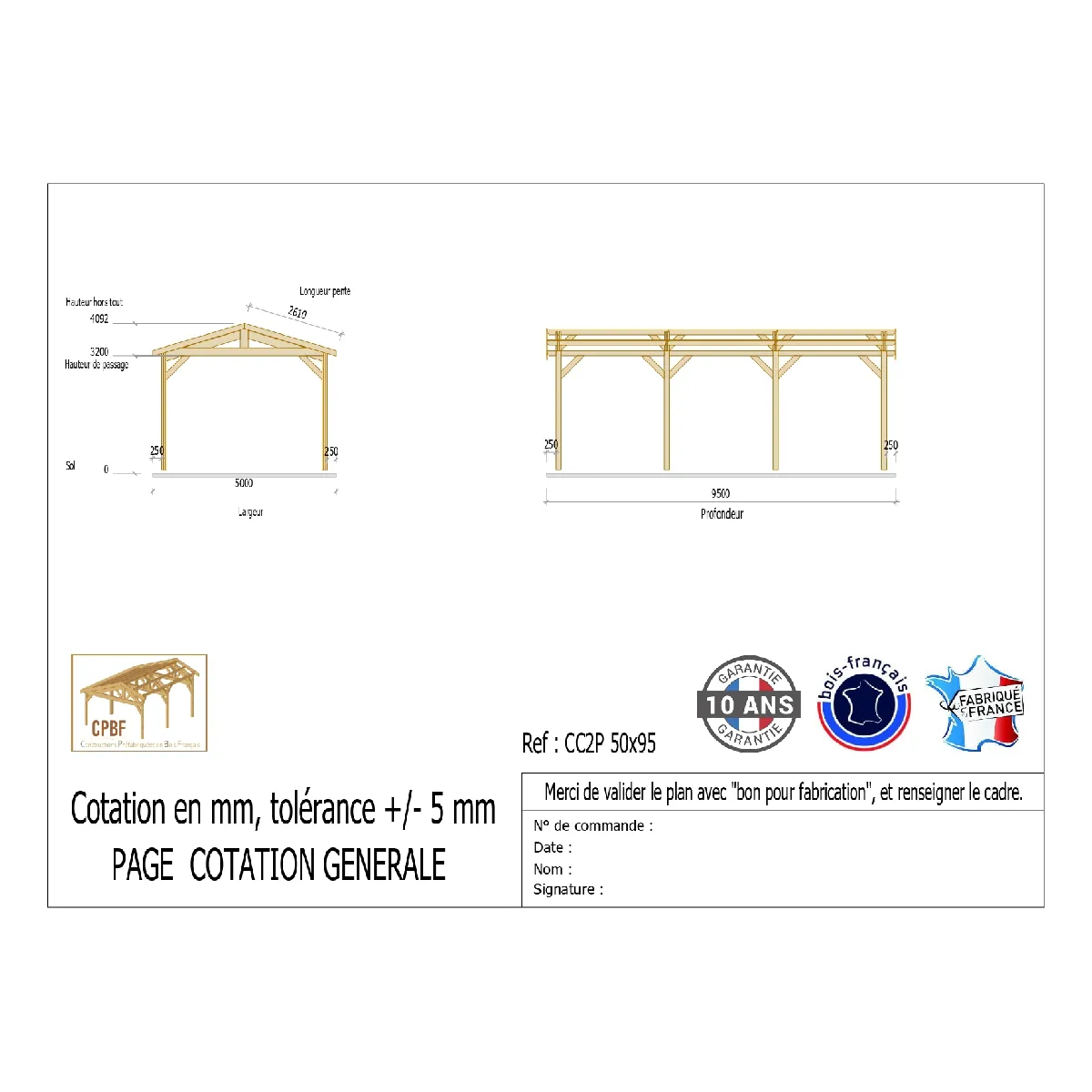 La charpente est réalisée en structure traditionnelle moisée pour une tenue rigoureuse, adaptée aux contraintes du stationnement extérieur. Les dimensions de 5 m de largeur et 9,5 m de longueur offrent un abri confortable pour un véhicule et la hauteur de 3,58 m autorise de bonnes marges de manuvre. Le bois Douglas, sélectionné en France, apporte une stabilité mécanique et une bonne tenue dans le temps. La géométrie de l'ensemble favorise des portées régulières et une implantation claire, limitant les points de faiblesse et simplifiant l'implantation sur l'emprise prévue.