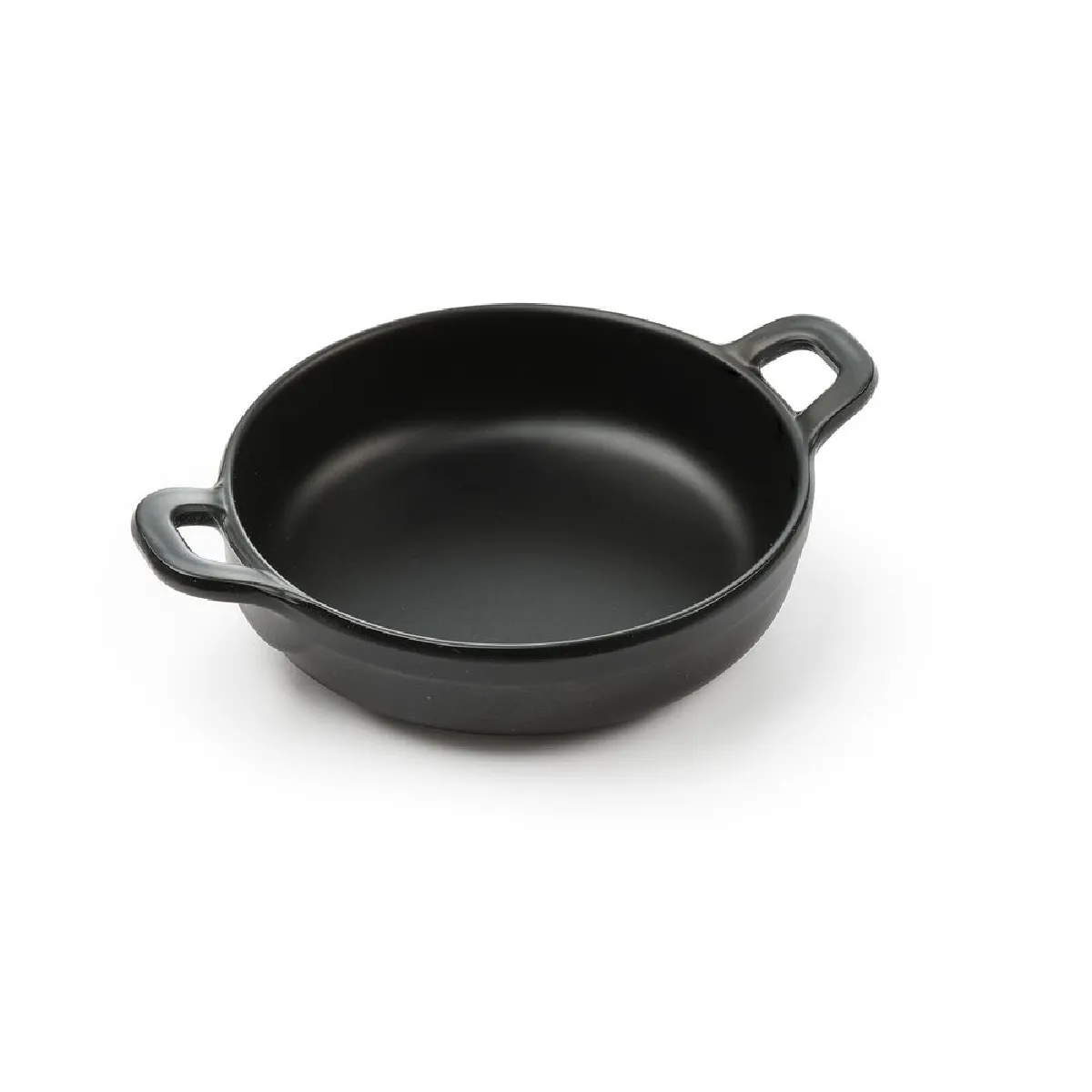 Bols et plats de présentation en mélamine, en forme de batterie de cuisine.