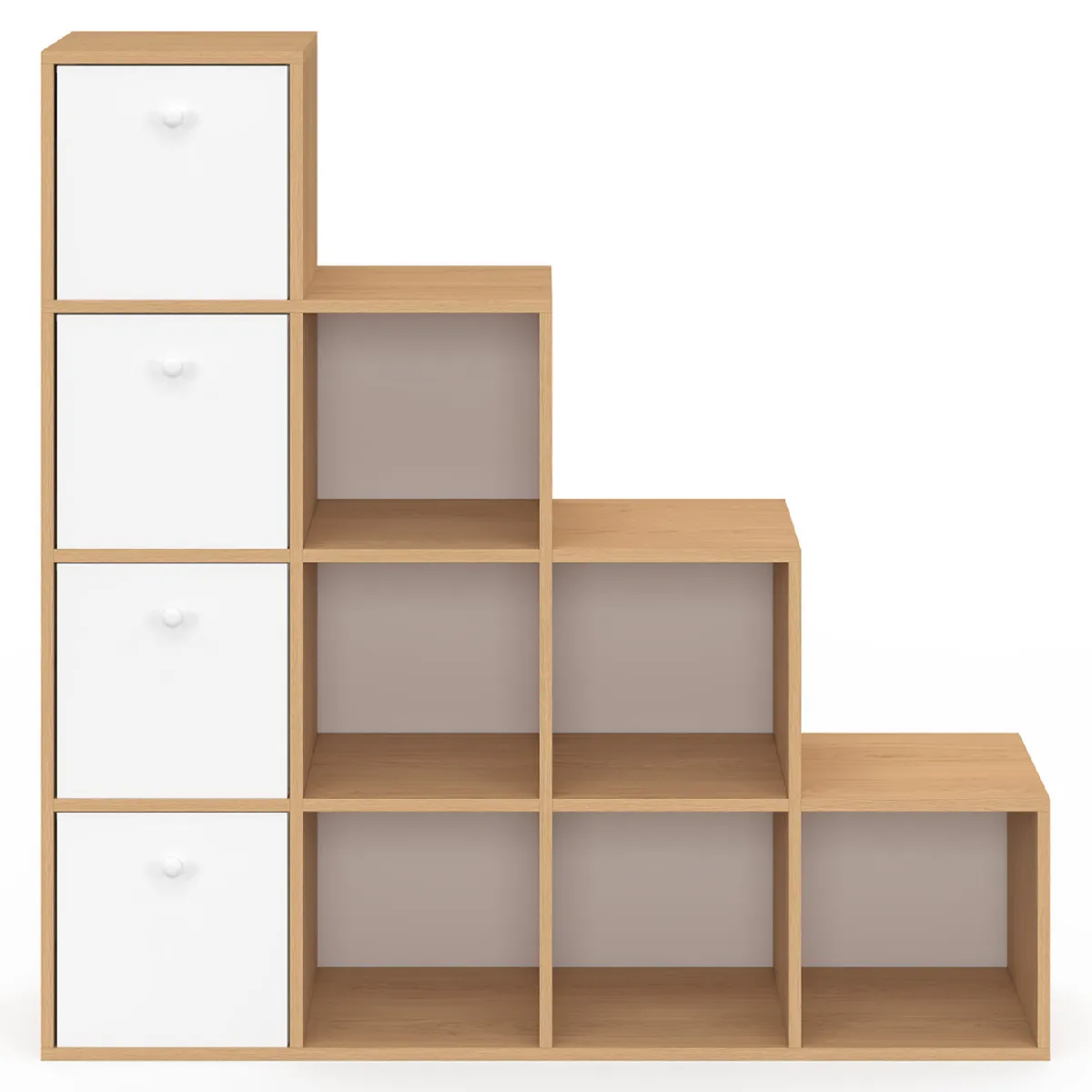 Découvrez un meuble de rangement élégant et fonctionnel en escalier bois et blanc qui s'intégrera à merveille dans votre chambre, bureau ou salon.Ce meuble cases offre de nombreuses possibilités de rangement, grâce à ses 10 casiers répartis sur 4 niveaux. Choisissez d'exposer vos objets de déco, vos livres, vos CD dans les cases ouvertes ou de ranger vos documents importants en toute discrétion dans les 4 tiroirs en tissus amovibles.Avec un design moderne et épuré, le meuble de rangement en escalier LORYS est le meuble parfait pour votre intérieur.Grâce à sa forme en dégradé, le meuble en escalier est idéal pour créer une séparation artificielle entre différents espaces d'une même pièce.Ainsi ce meuble trouvera aussi bien sa place dans un studio, faisant office de cloison pour séparer le coin nuit de l'espace de travail, par exemple, que dans un grand espace.Alors n'hésitez plus et craquez pour ce meuble de rangement bois et blanc à petit prix qui saura répondre à tous vos besoins !Dimensions du meuble de rangement en escalier LORYS bois et blancDimensions globales : Longueur 117 cm x largeur 30 cm x Hauteur 117 cmDimensions d'une case : L. 27,7 x l. 30 x H. 27,7 cmDimensions d'un tiroir tissu : L. 27 x l. 29 cm x H. 27,5 cmMatériaux : particules de bois (PB)Coloris : bois et blancÀ monter soi-mêmeDécouvrez l'ensemble de notre collection moderne sur notre site internet?!