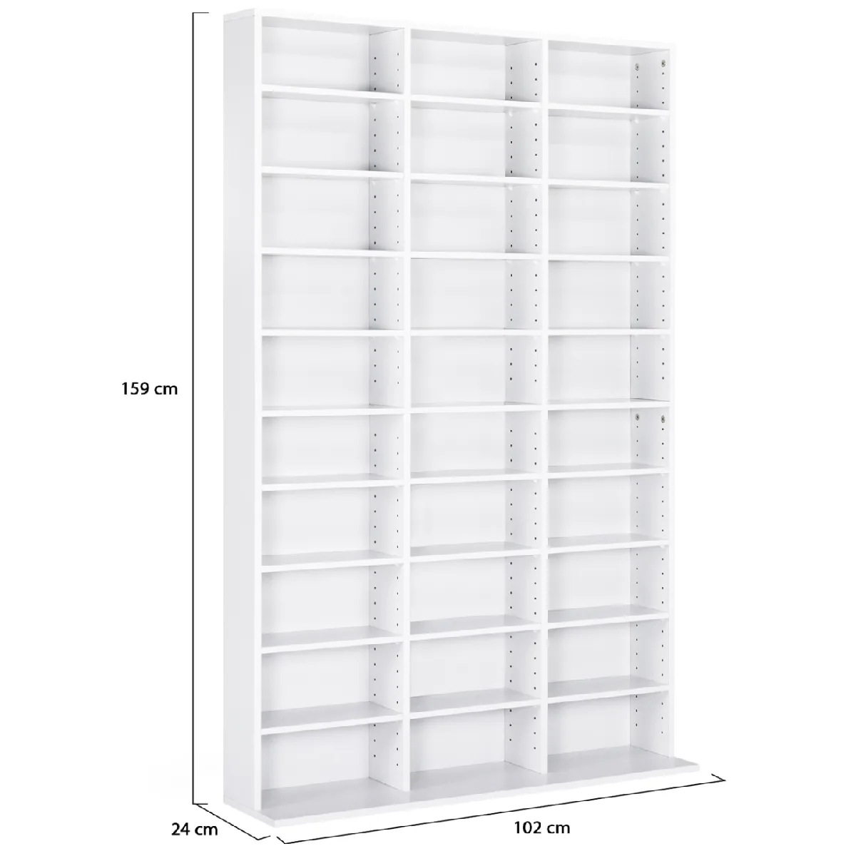 Vous entassez de nombreux livres ou CD et ne savez plus où les ranger ? Grâce au meuble de rangement CEYLIA et ses 30 étagères entièrement modulables, vous pouvez désormais regrouper l'intégralité de votre collection à un endroit pour les garder toujours à portée de main. Vous qui avez toujours rêvé d'une bibliothèque sur mesure, créez désormais la vôtre et adaptez la hauteur des étagères en fonction de vos besoins. Amateur de musique : cette étagère peut accueillir jusqu'à 960 CD de quoi vous offrir tout l'espace dont vous avez besoin pour organiser votre collection par genre, artiste ou même par ordre alphabétique ! Ses dimensions parfaites de 102x24x159 cm allient ergonomie et maxi capacité de stockage ! Vous permettant ainsi de l'installer même dans les plus petites pièces pour profitez d'un espace de rangement optimisé.Que ce soit dans un bureau, une chambre ou votre salon, le design blanc et sobre du meuble bibliothèque CEYLIA s'intègrera à n'importe quel aménagement intérieur et mettra en avant objets de collection et de décoration.Stable, robuste, modulable et dotée d'une grande capacité de rangement, cette étagère a tout les atouts du meuble indispensable à avoir chez soit ! Dimensions du meuble de rangement bibliothèque étagère CD CEYLIADimensions globales : Longueur 102 cm x largeur 24 cm x Hauteur 159 cm30 cases ajustables en hauteurDimension d'une case de rangement (au plus petit) : L.32 x l.14,5 x H.14,8 cmMatériaux : panneaux de particules 15 mm et 12 mm d'épaisseurColoris : blancÉtagères amoviblesAccueille jusqu'à 960 CDÀ monter soi-mêmeCette étagère bibliothèque existe également en coloris bois. Retrouvez l'ensemble de nos étagères et meubles de rangement sur notre boutique en ligne !